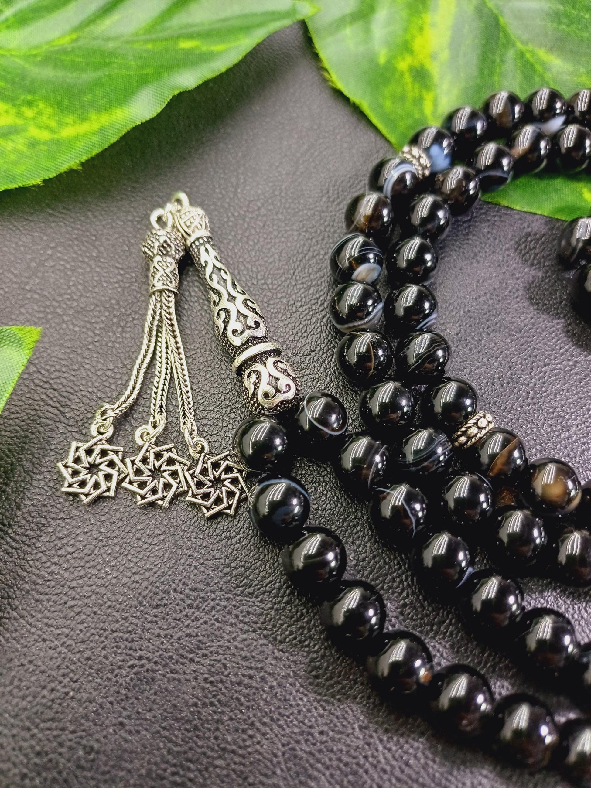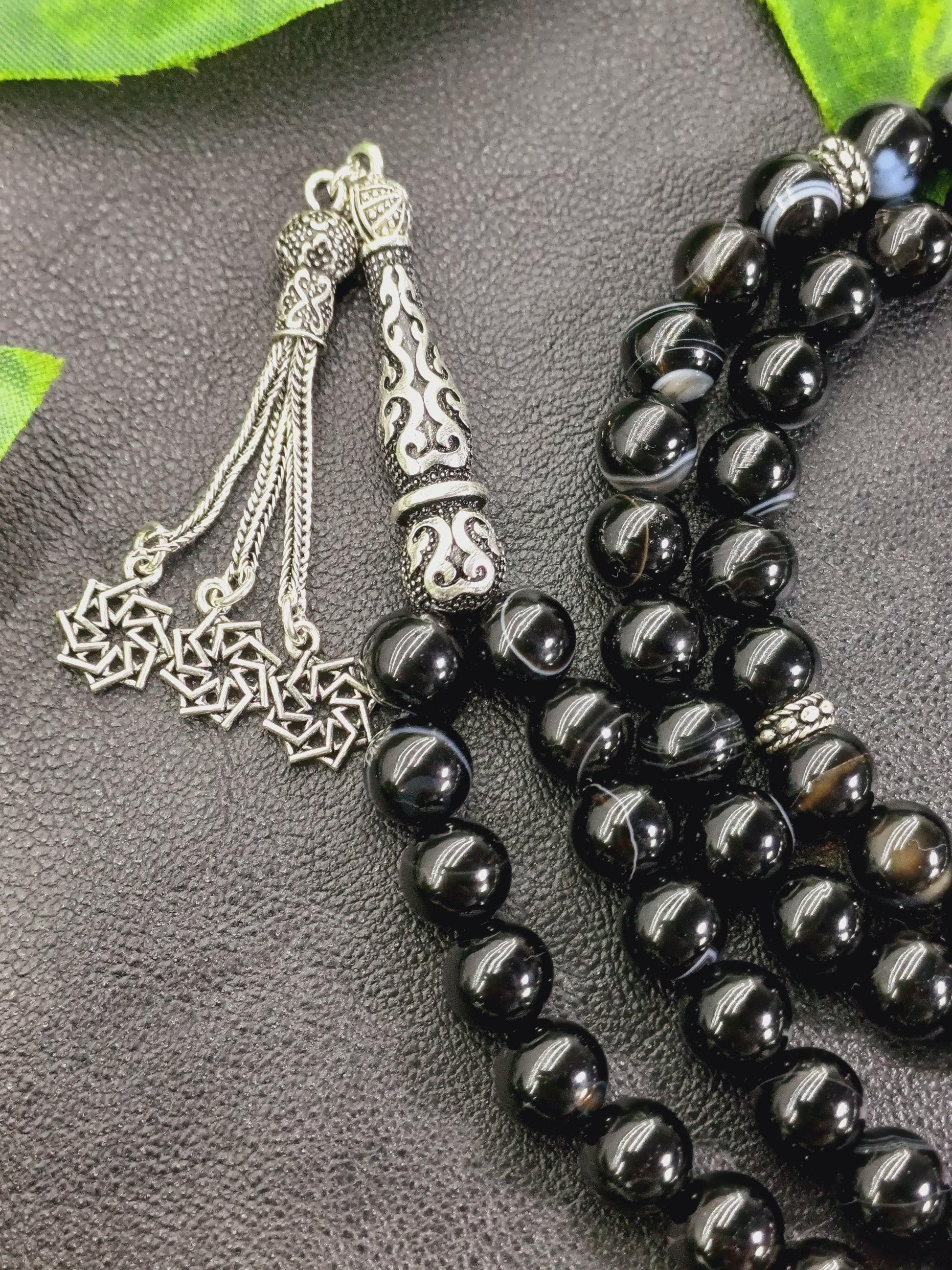 Siyah Akik doğal taşından yapılmış, 925 ayar gümüş aparatlı bu özel tesbih, hem şık bir aksesuar hem de enerjinizi dengelemeye yardımcı bir taş deneyimi sunar.