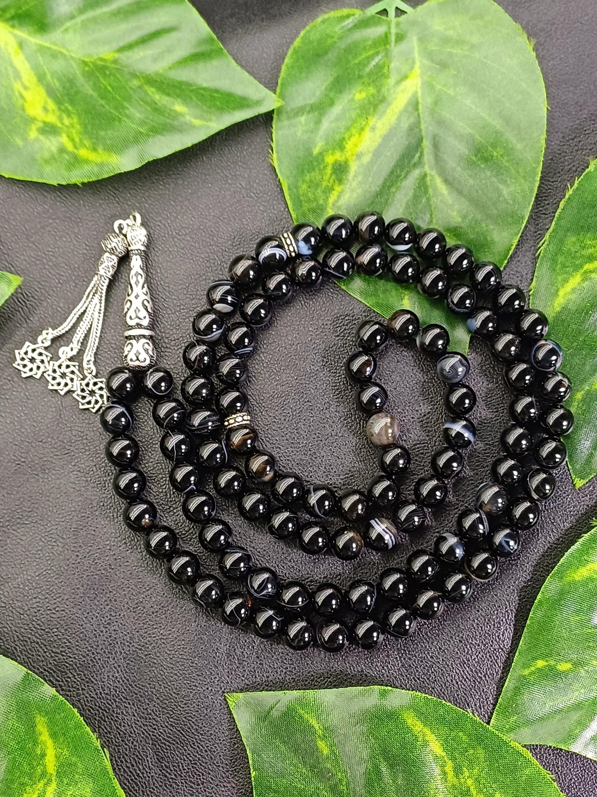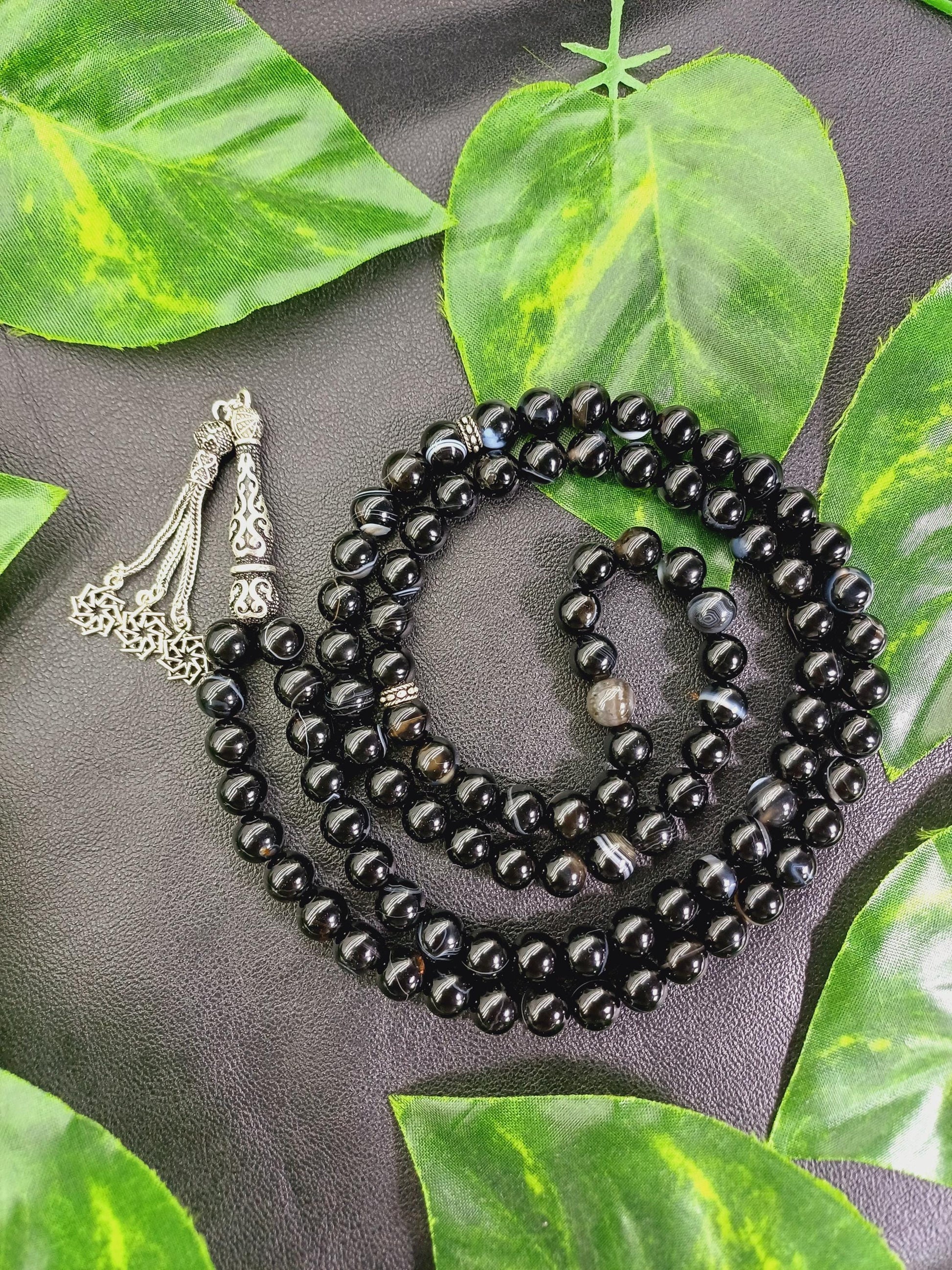 925 Ayar Gümüş 99 Boncuklu Siyah Akik Tesbih