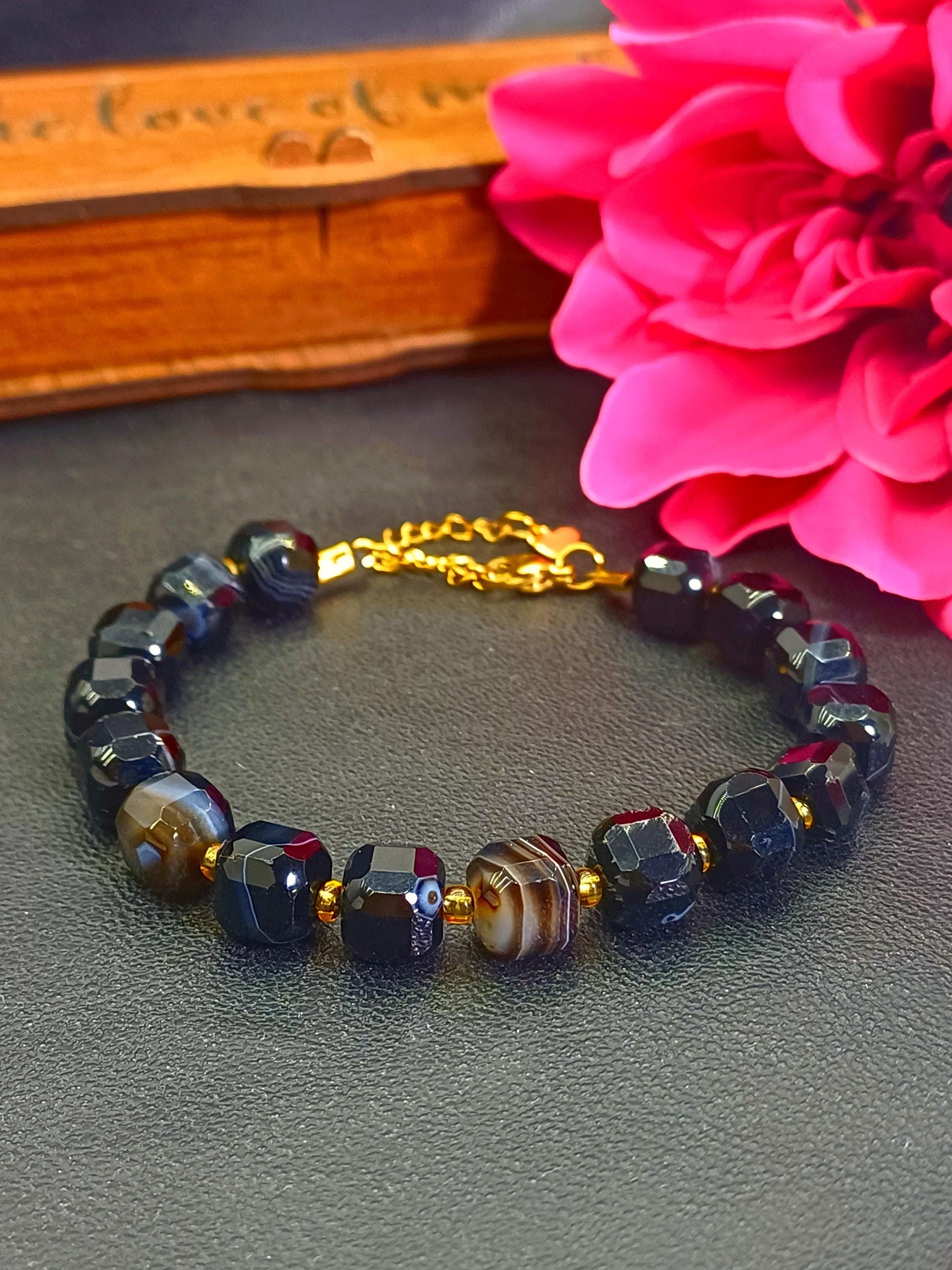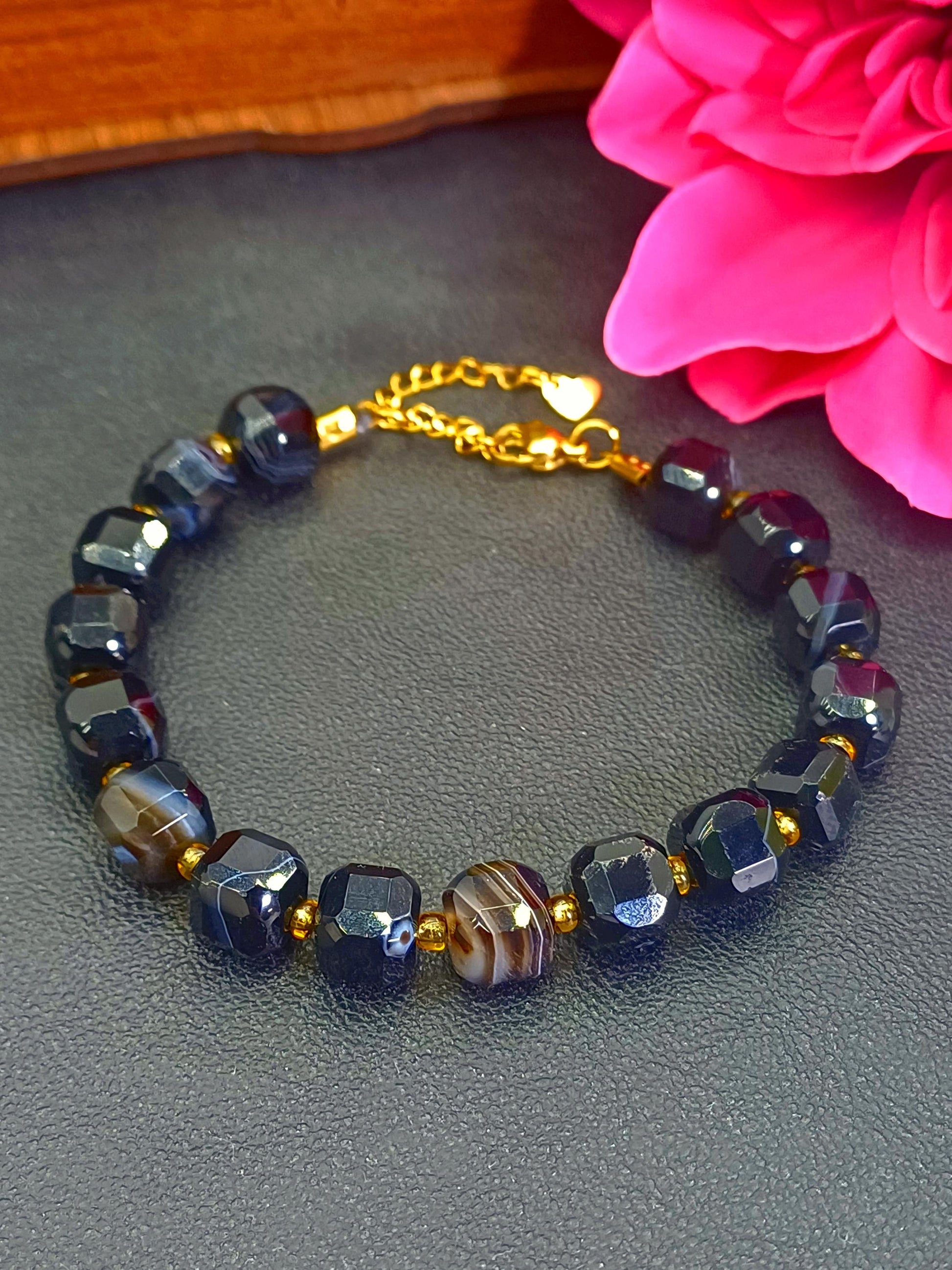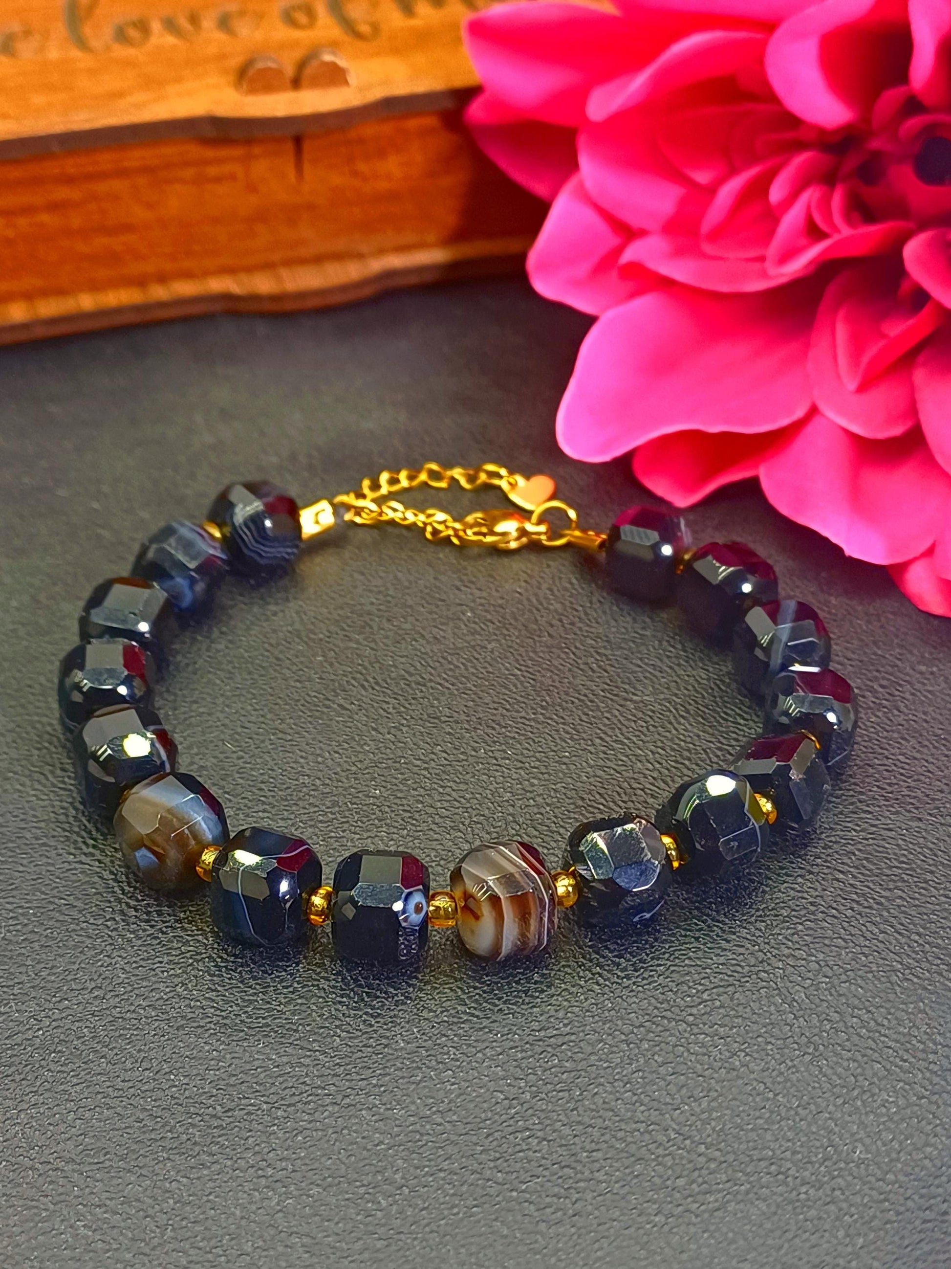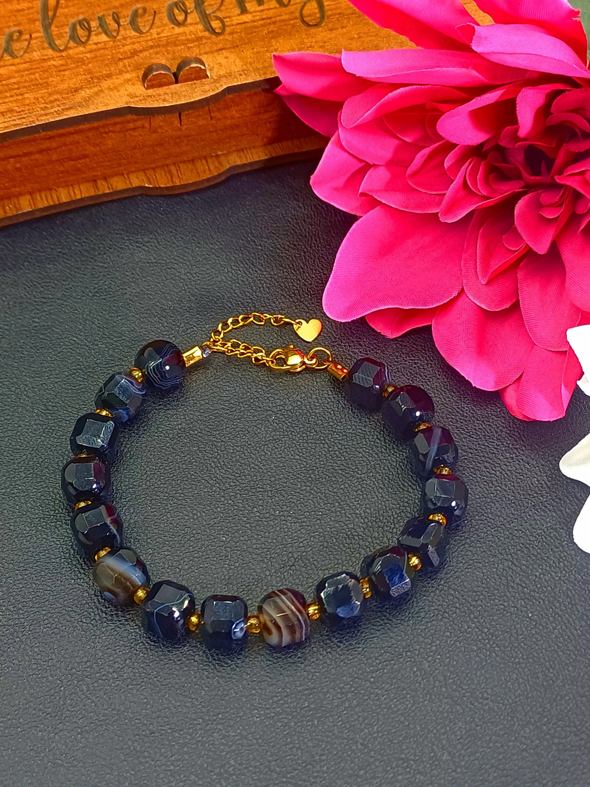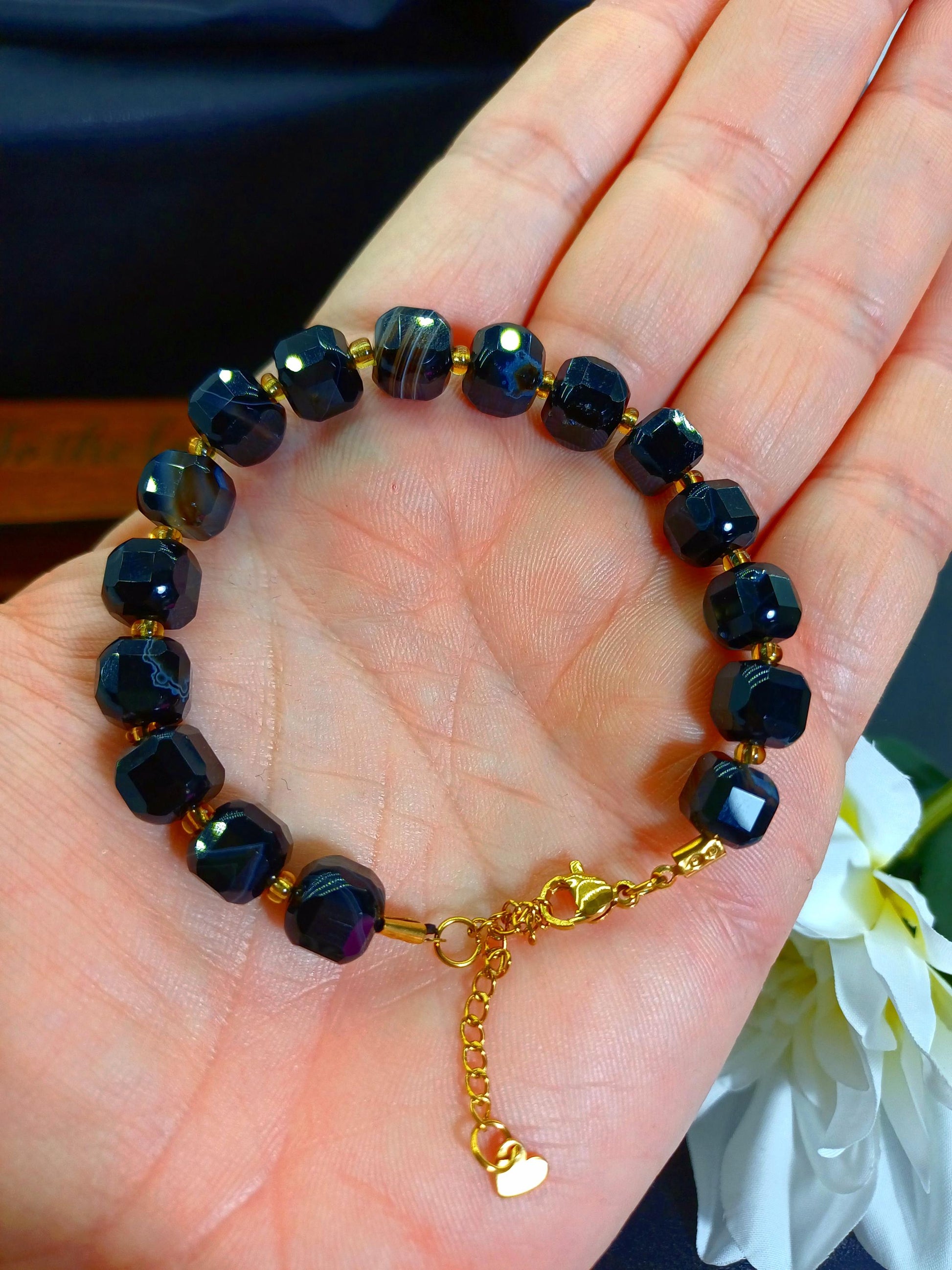 Küp Kesim Siyah Akik doğal taşından yapılmış bu özel bileklik, hem şık bir aksesuar hem de enerjinizi dengelemeye yardımcı bir taş deneyimi sunar.