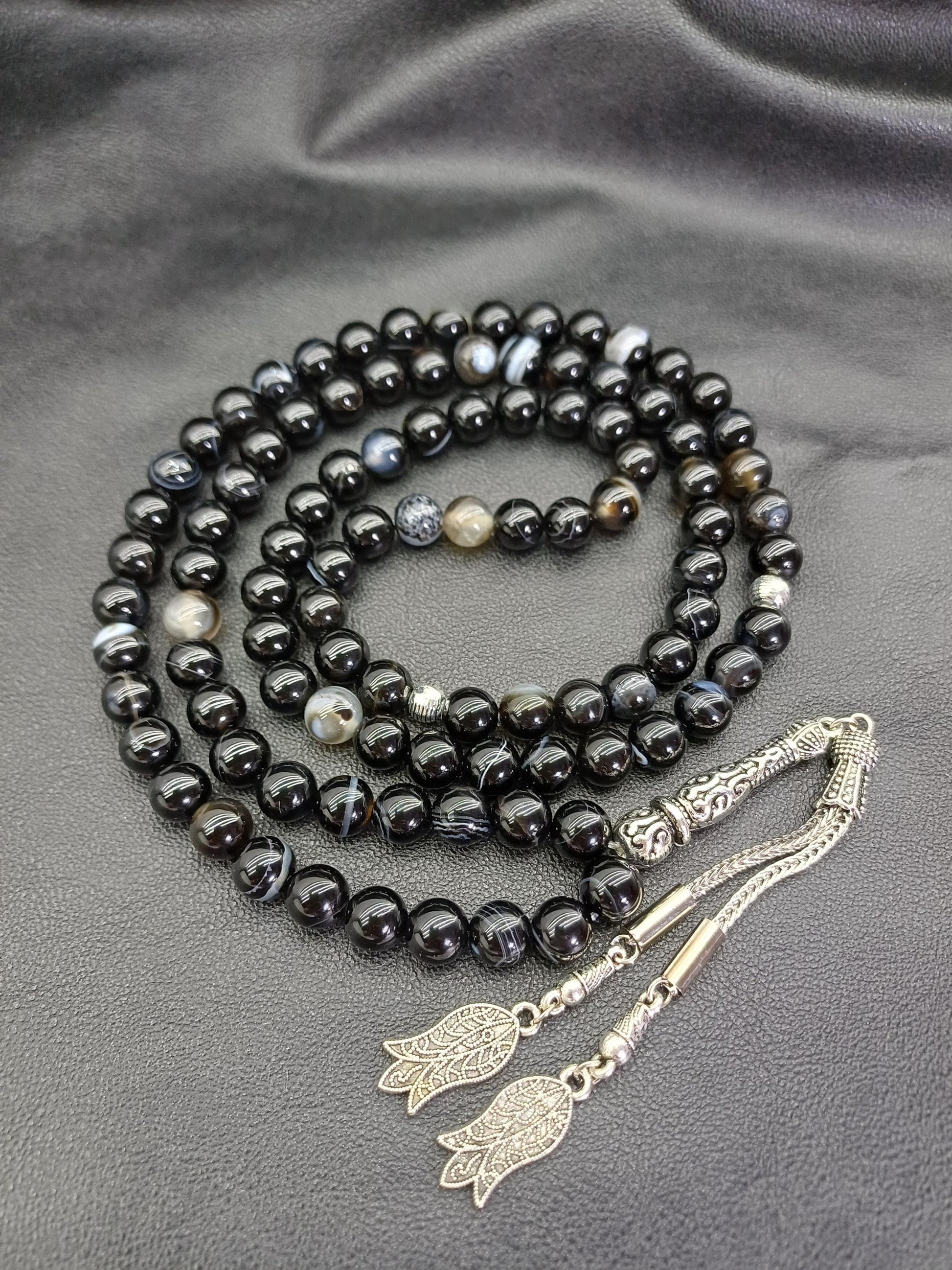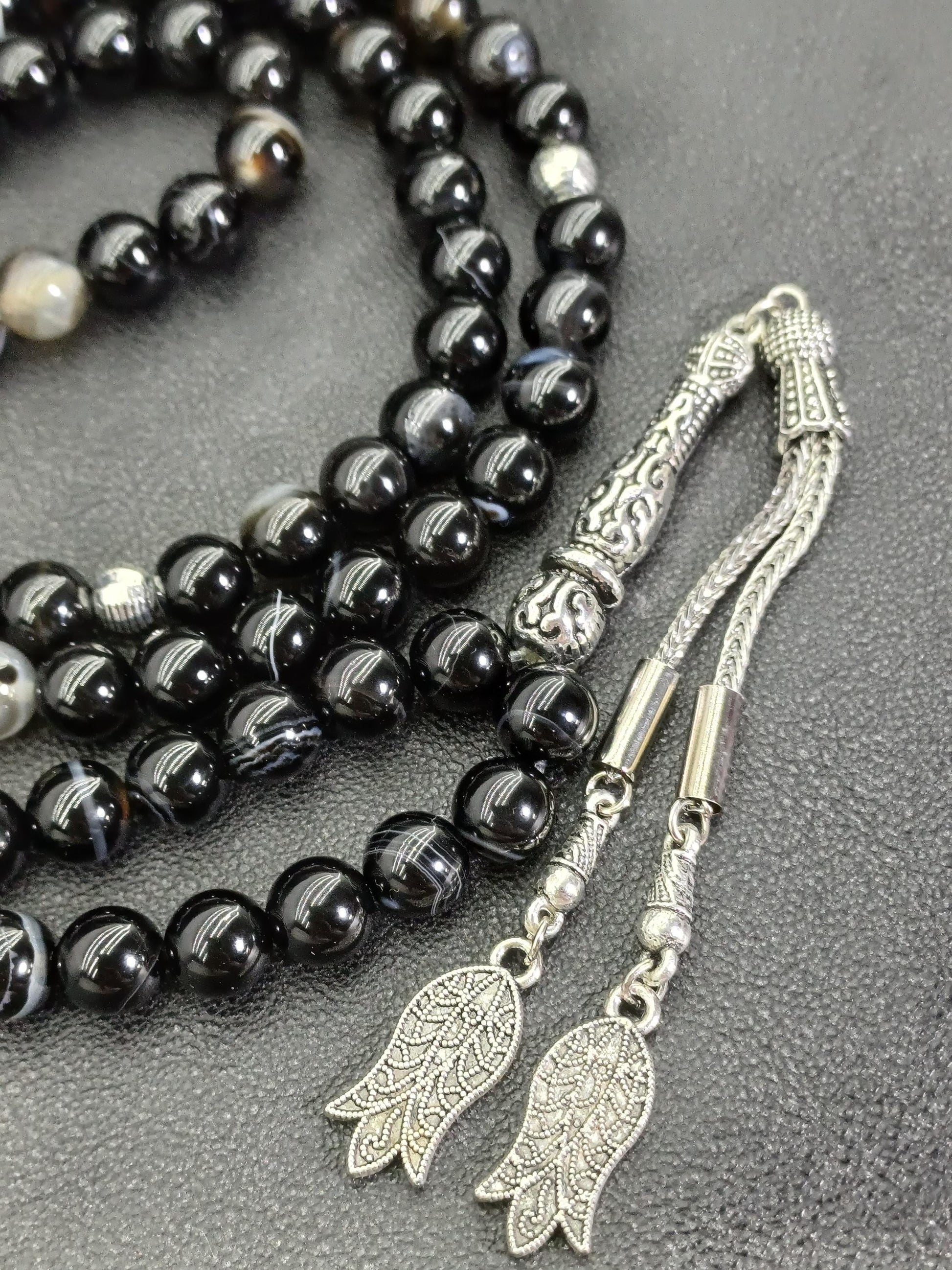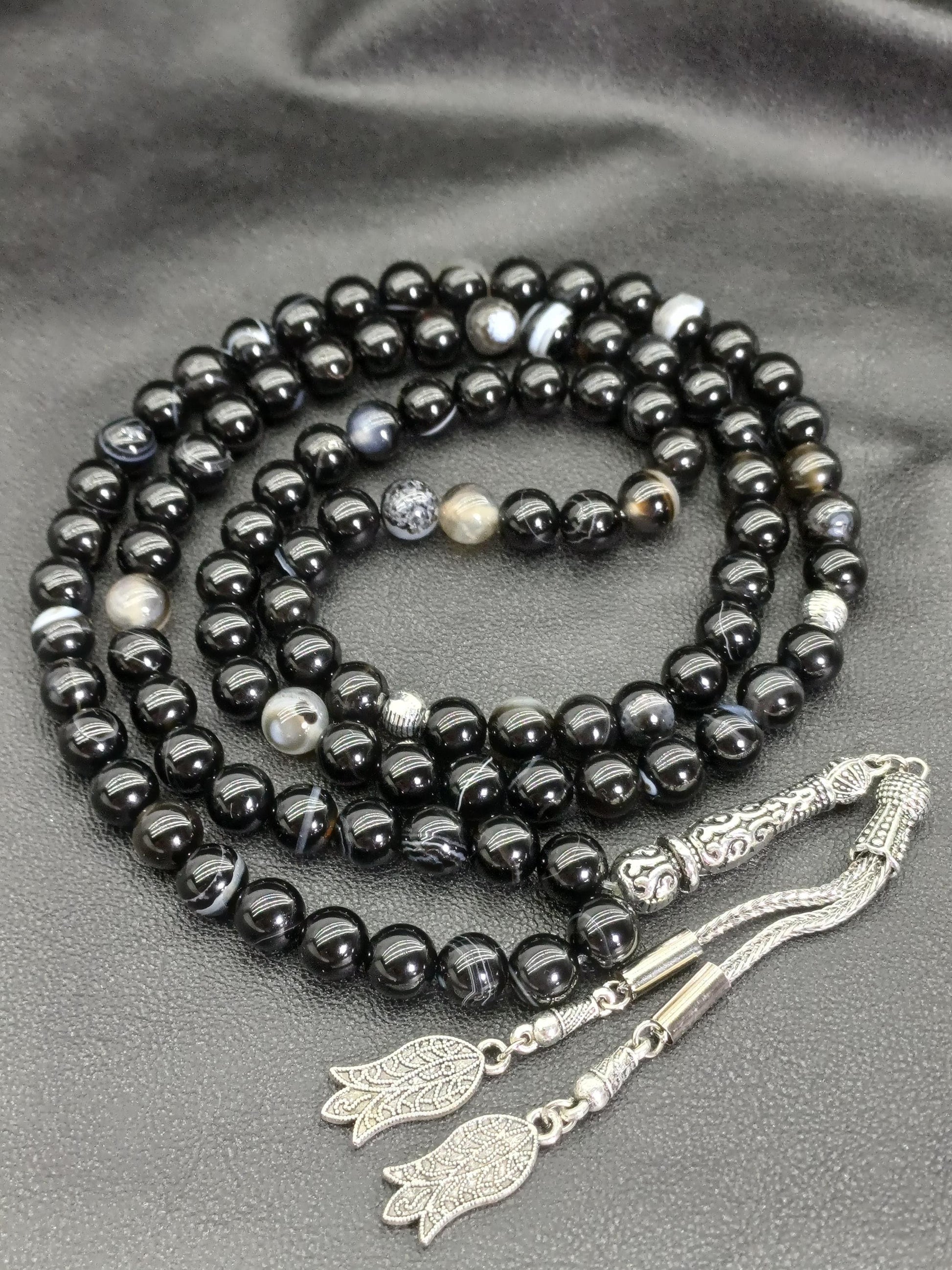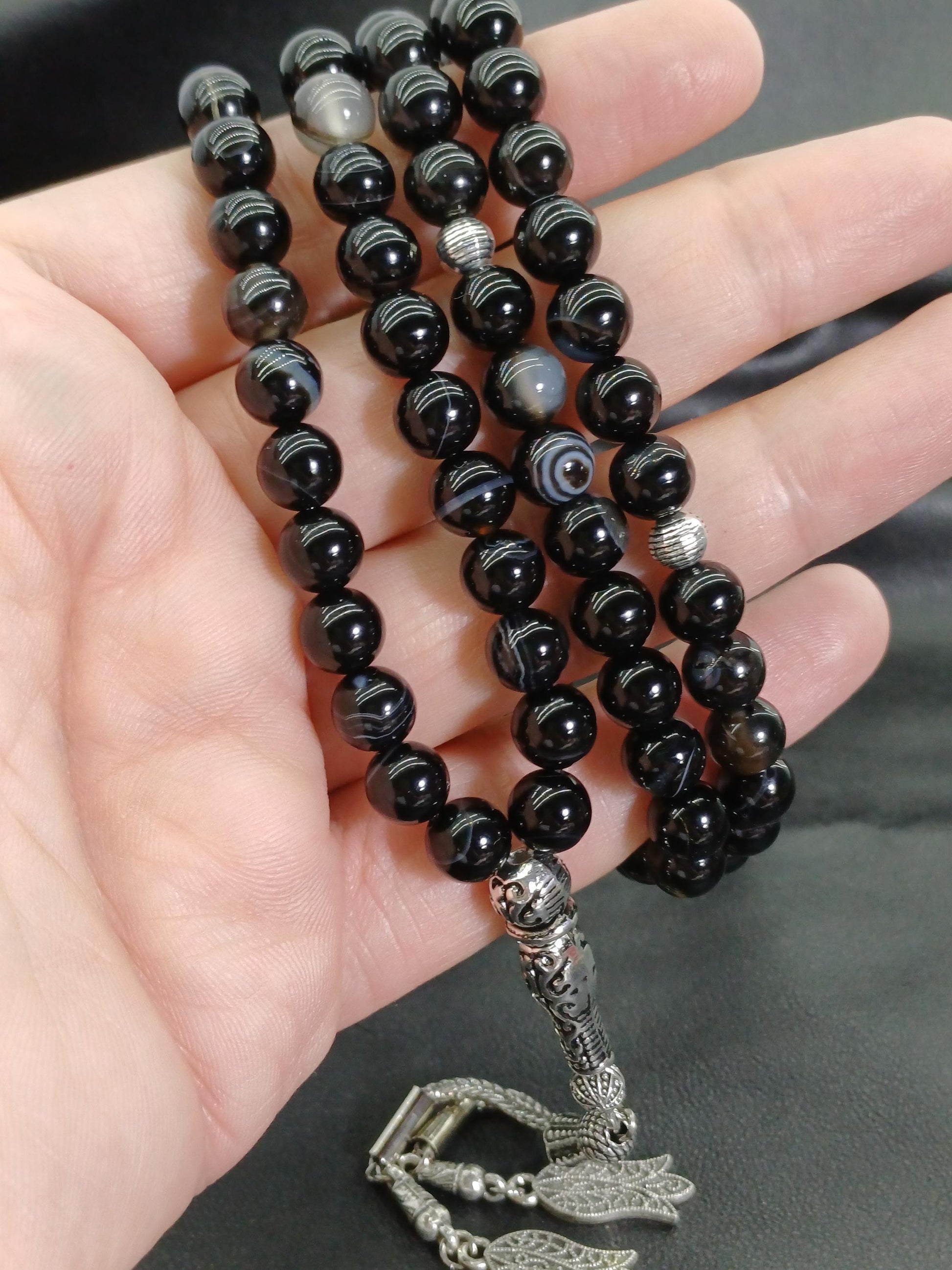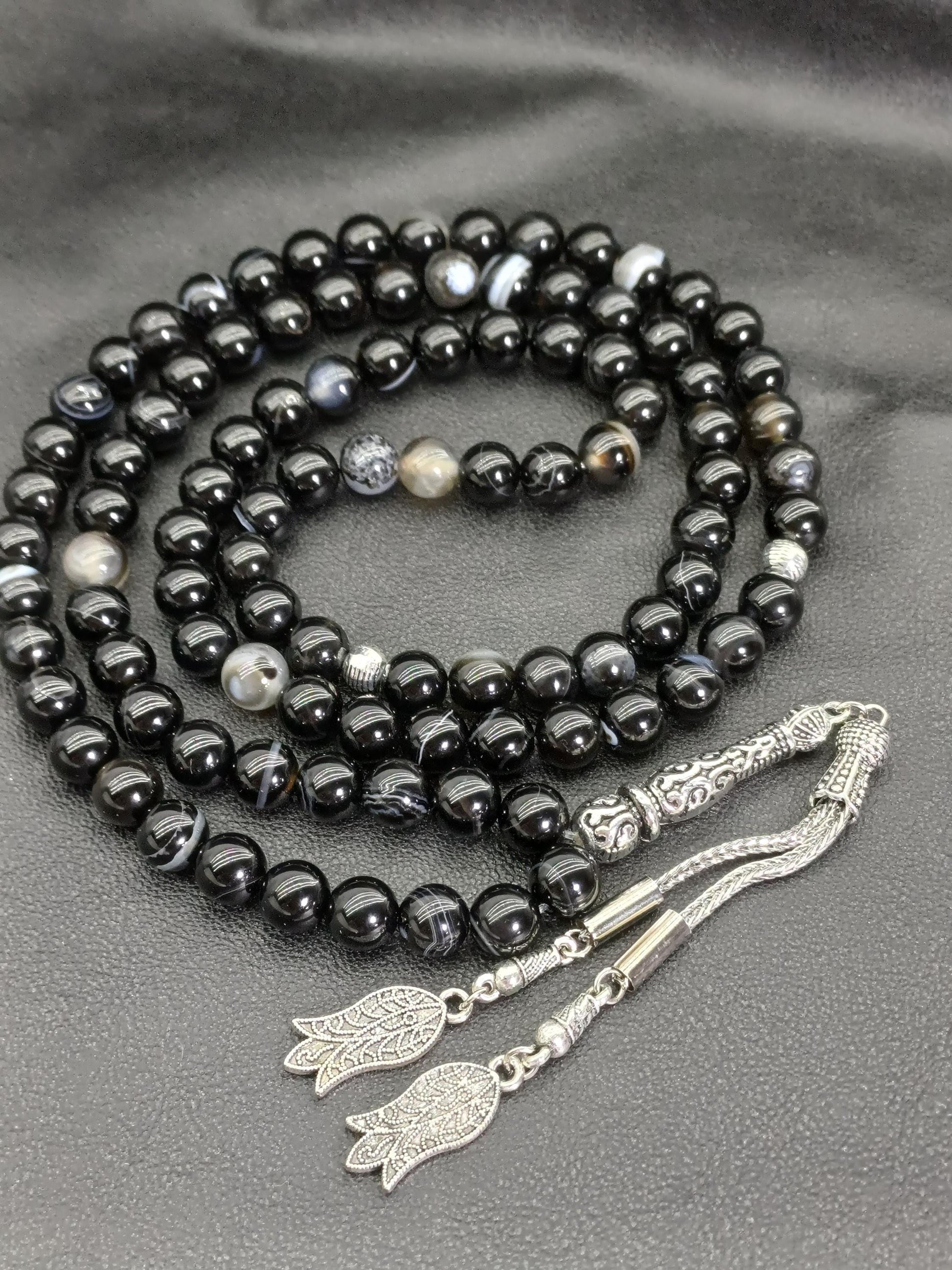 Siyah Akik doğal taşından yapılmış bu özel tesbih, hem şık bir aksesuar hem de enerjinizi dengelemeye yardımcı bir taş deneyimi sunar.