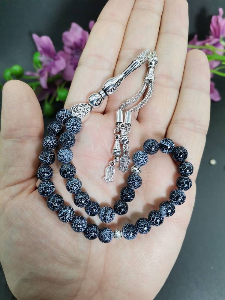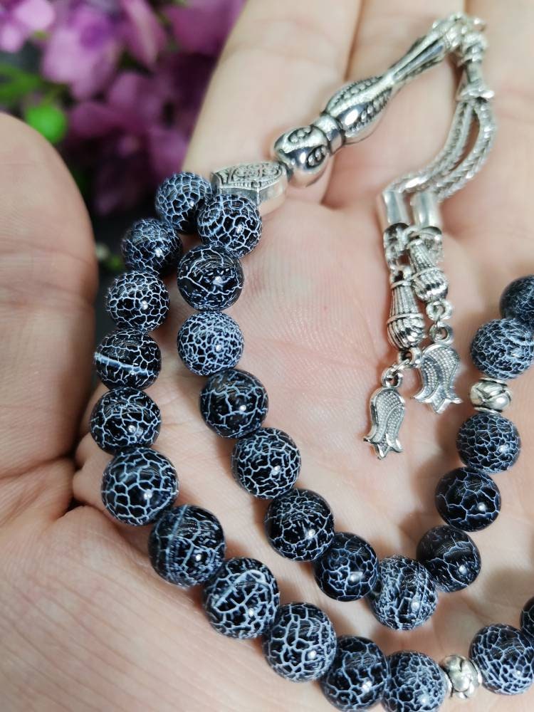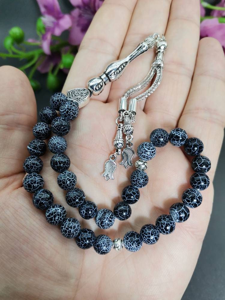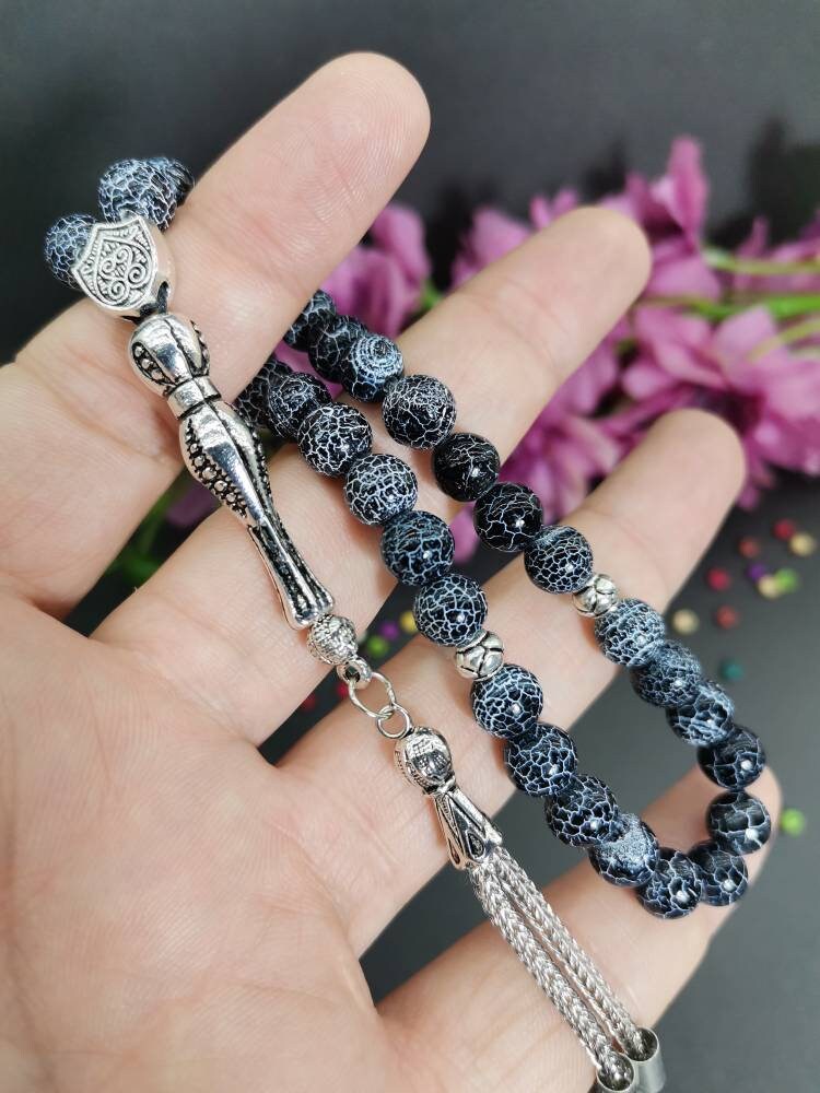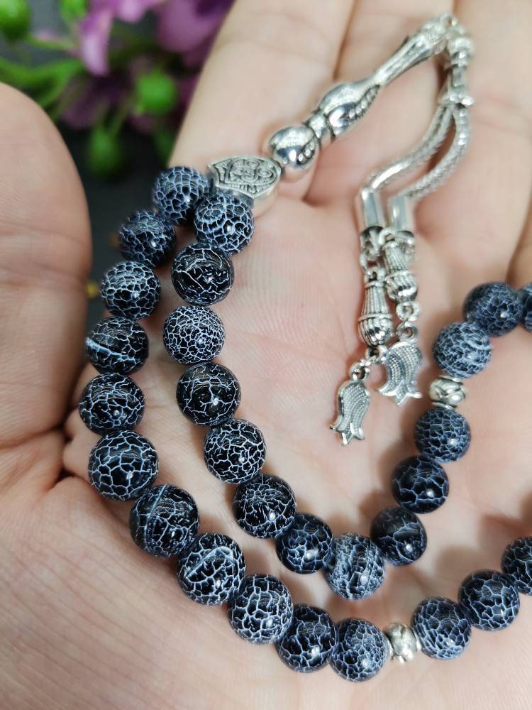Damarlı Siyah Akik doğal taşından yapılmış bu özel tesbih, hem şık bir aksesuar hem de enerjinizi dengelemeye yardımcı bir taş deneyimi sunar.