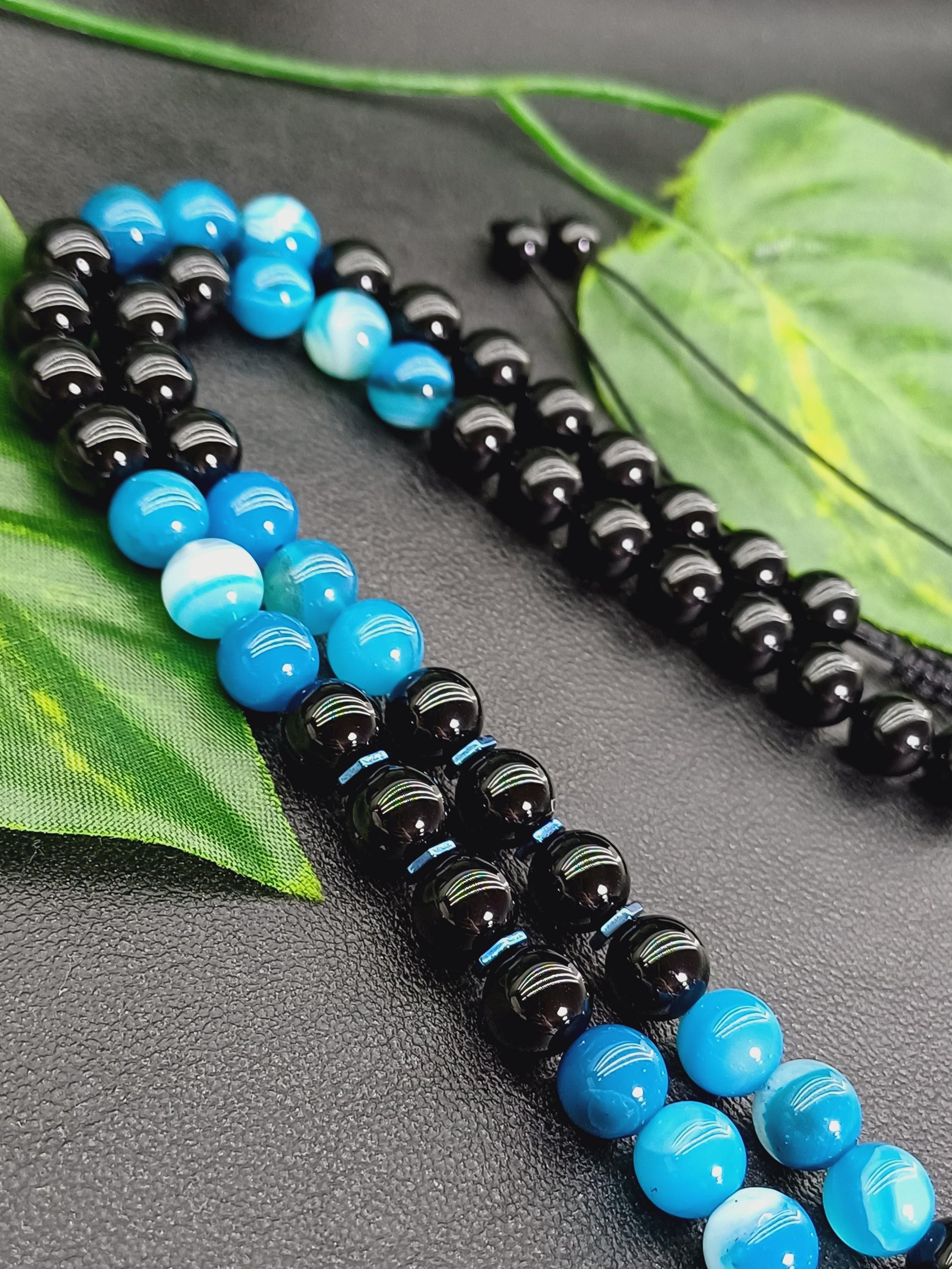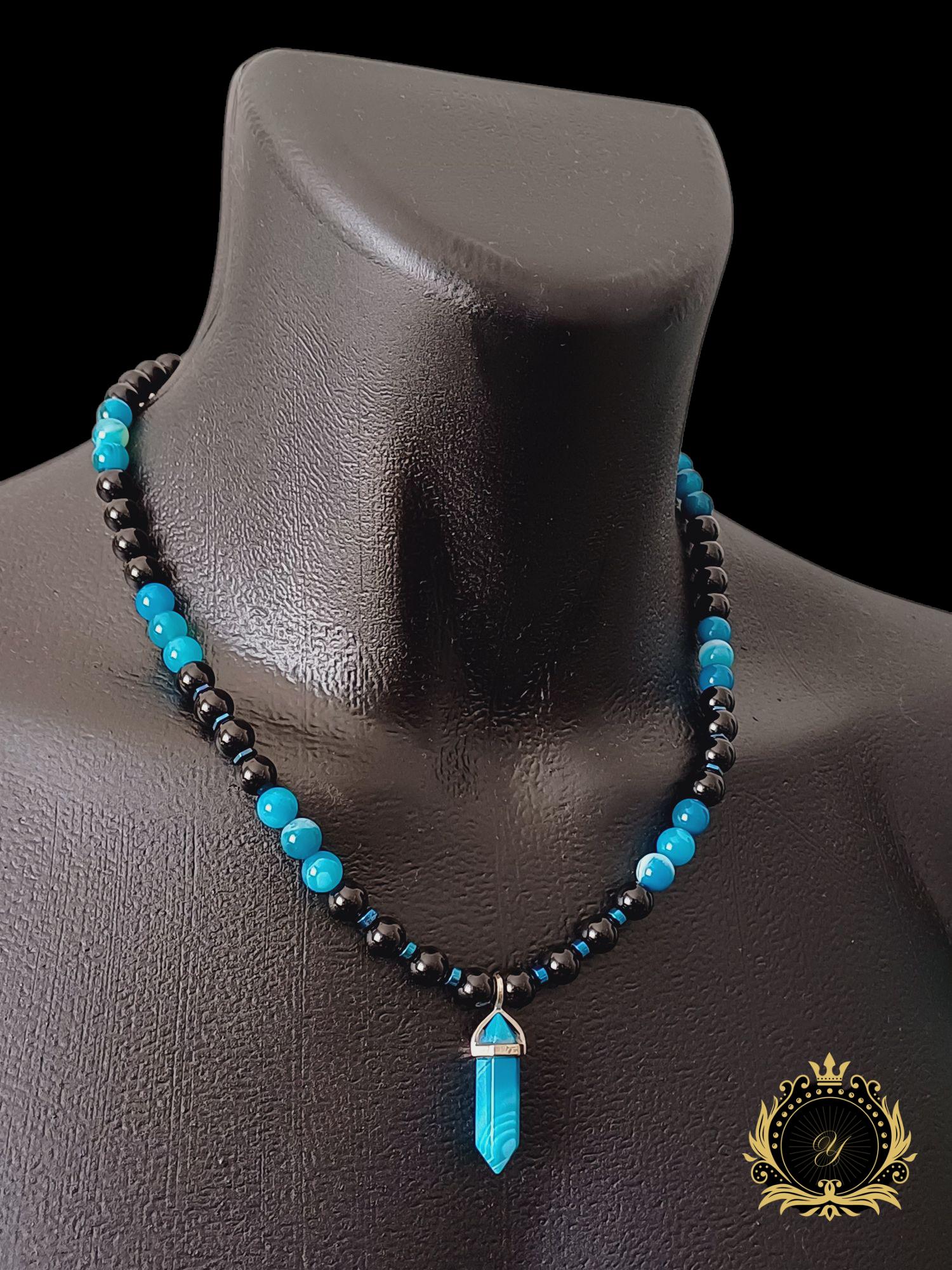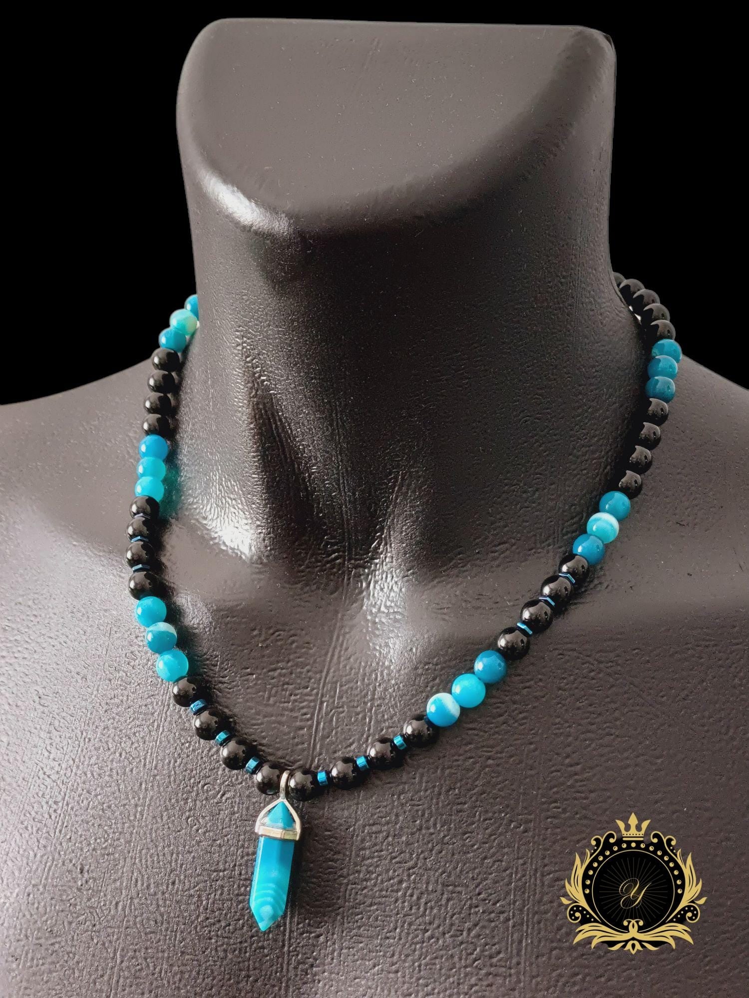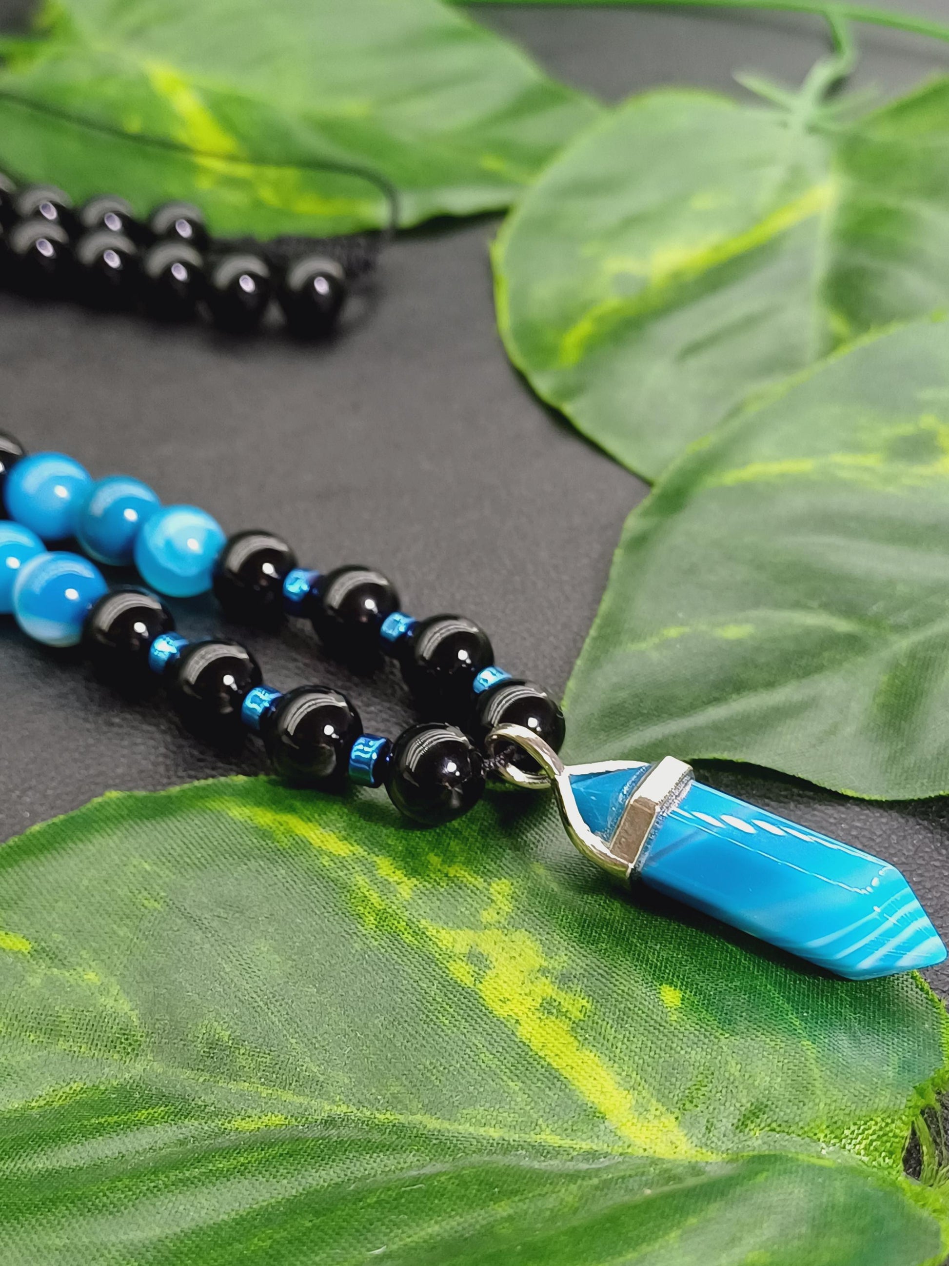 Mavi Akik & Siyah Oniks doğal taşlarından yapılmış bu özel kolye, hem şık bir aksesuar hem de enerjinizi dengelemeye yardımcı bir taş deneyimi sunar.