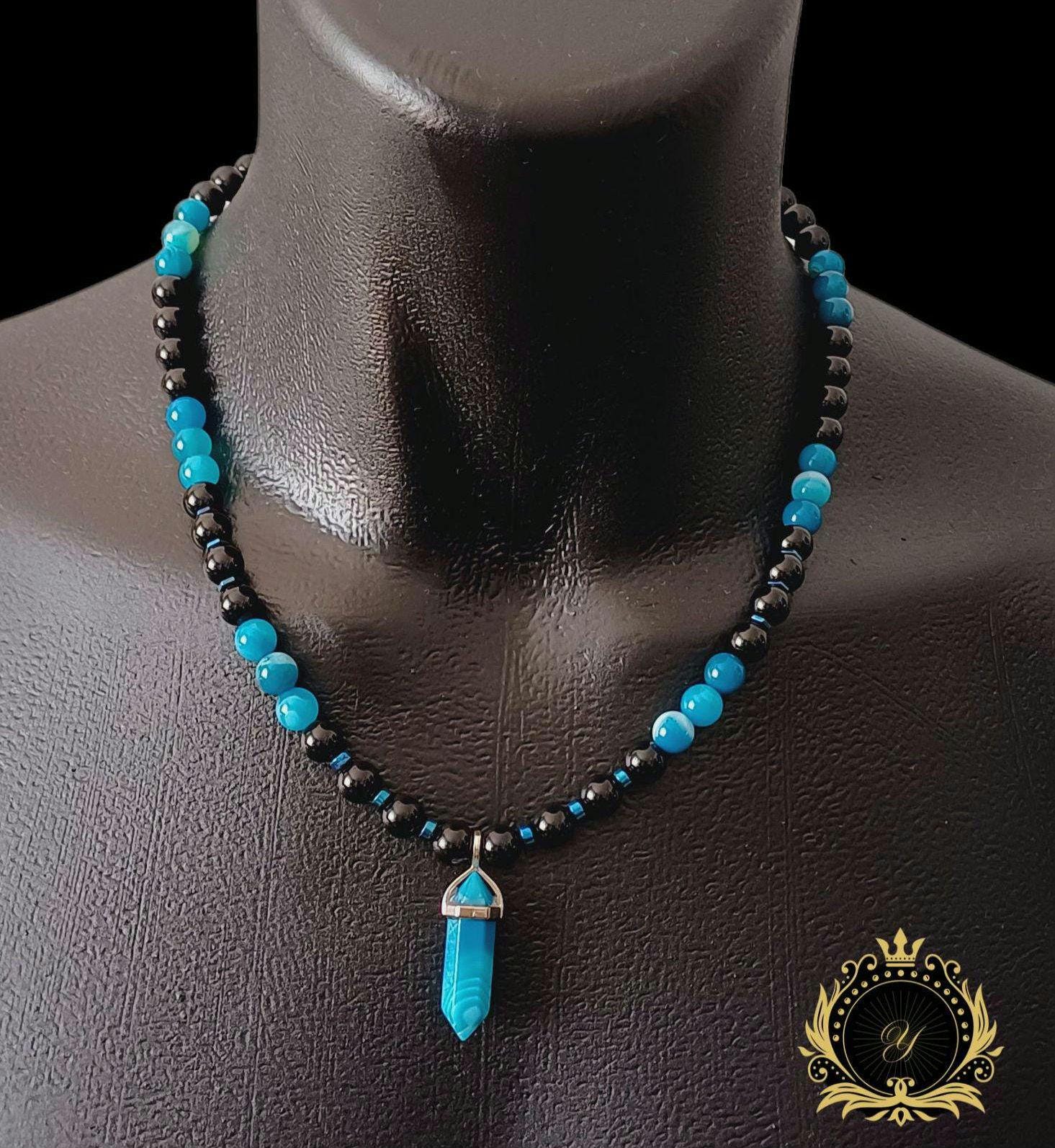Mavi Akik & Siyah Oniks Erkek Doğaltaş Kolye