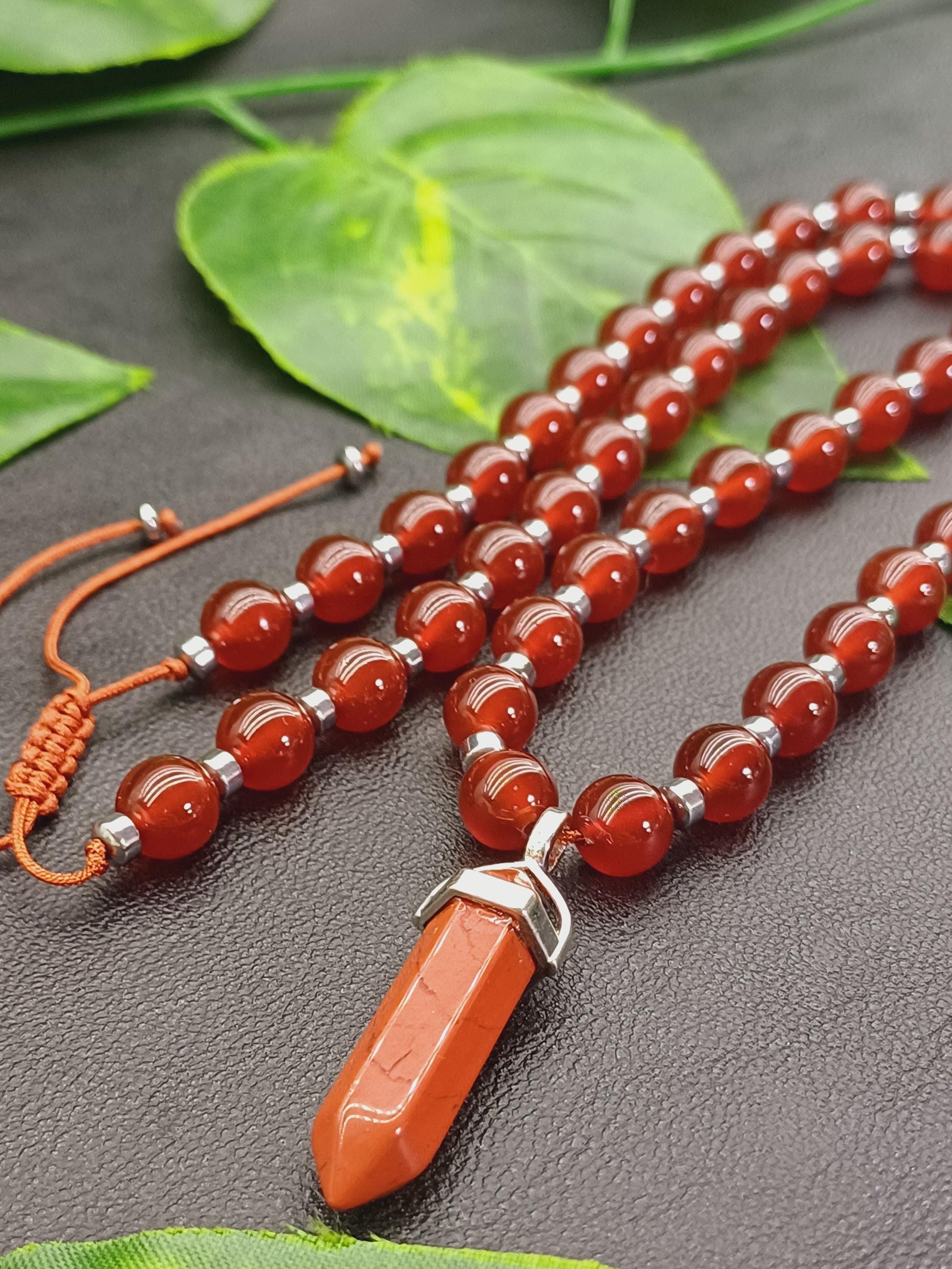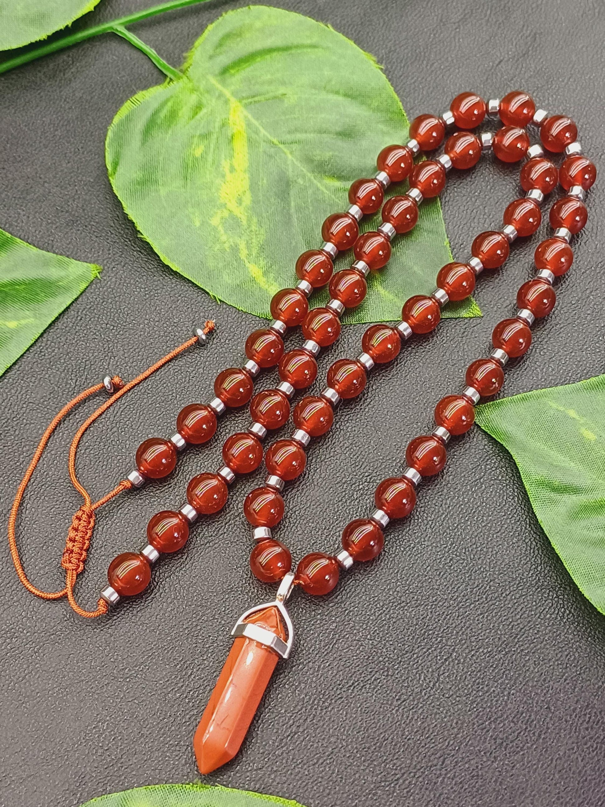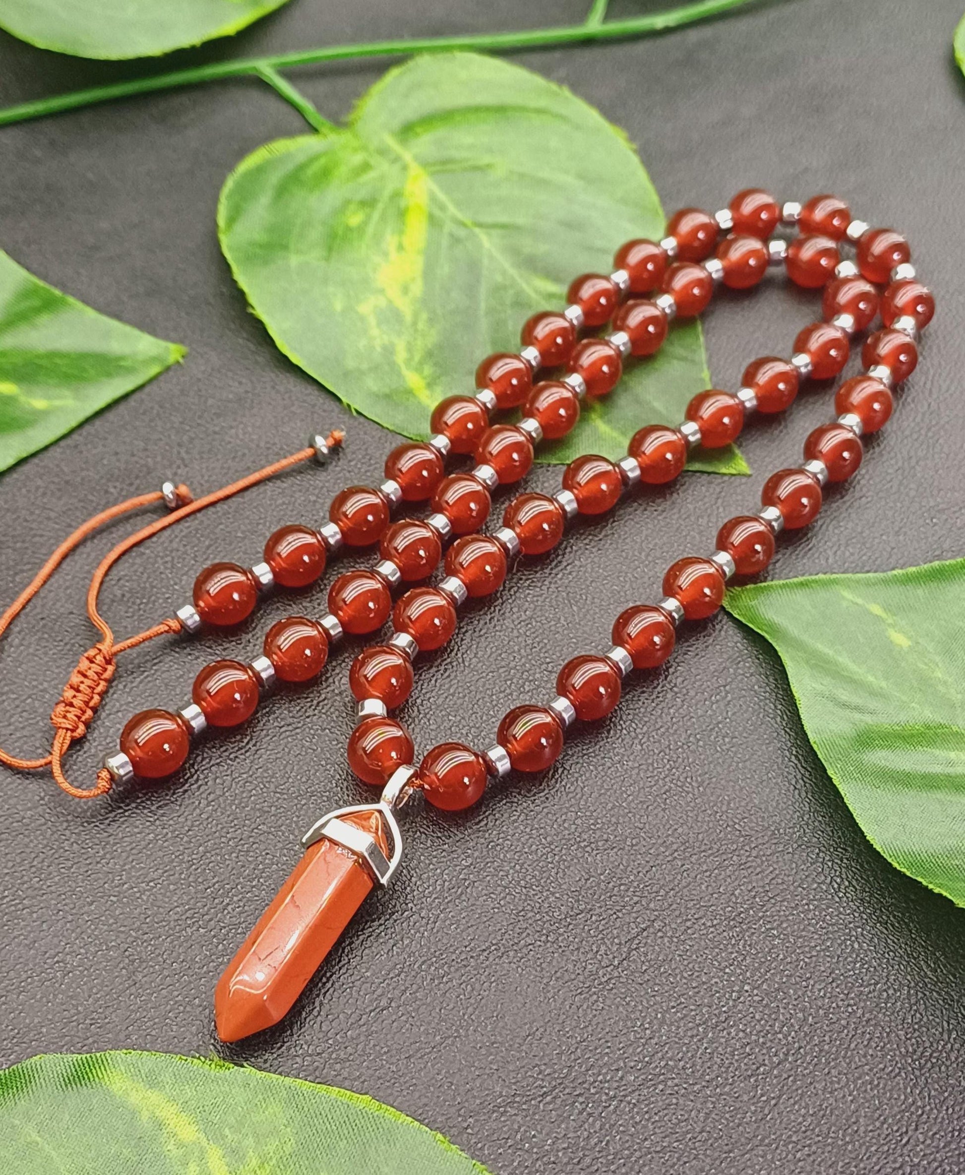 Kırmızı Jasper uçlu Karnelyan Akik doğal taşından yapılmış bu özel kolye, hem şık bir aksesuar hem de enerjinizi dengelemeye yardımcı bir taş deneyimi sunar.