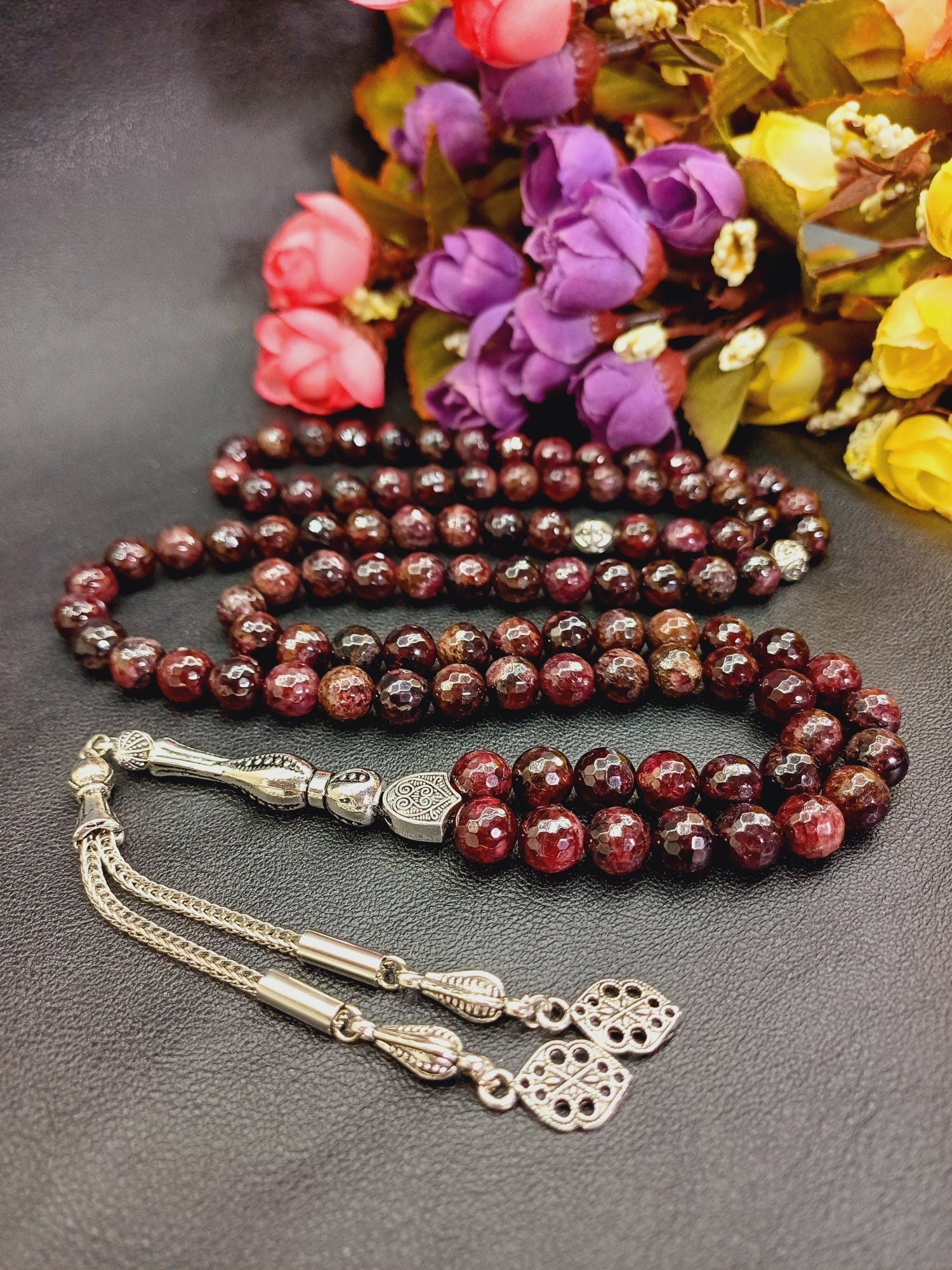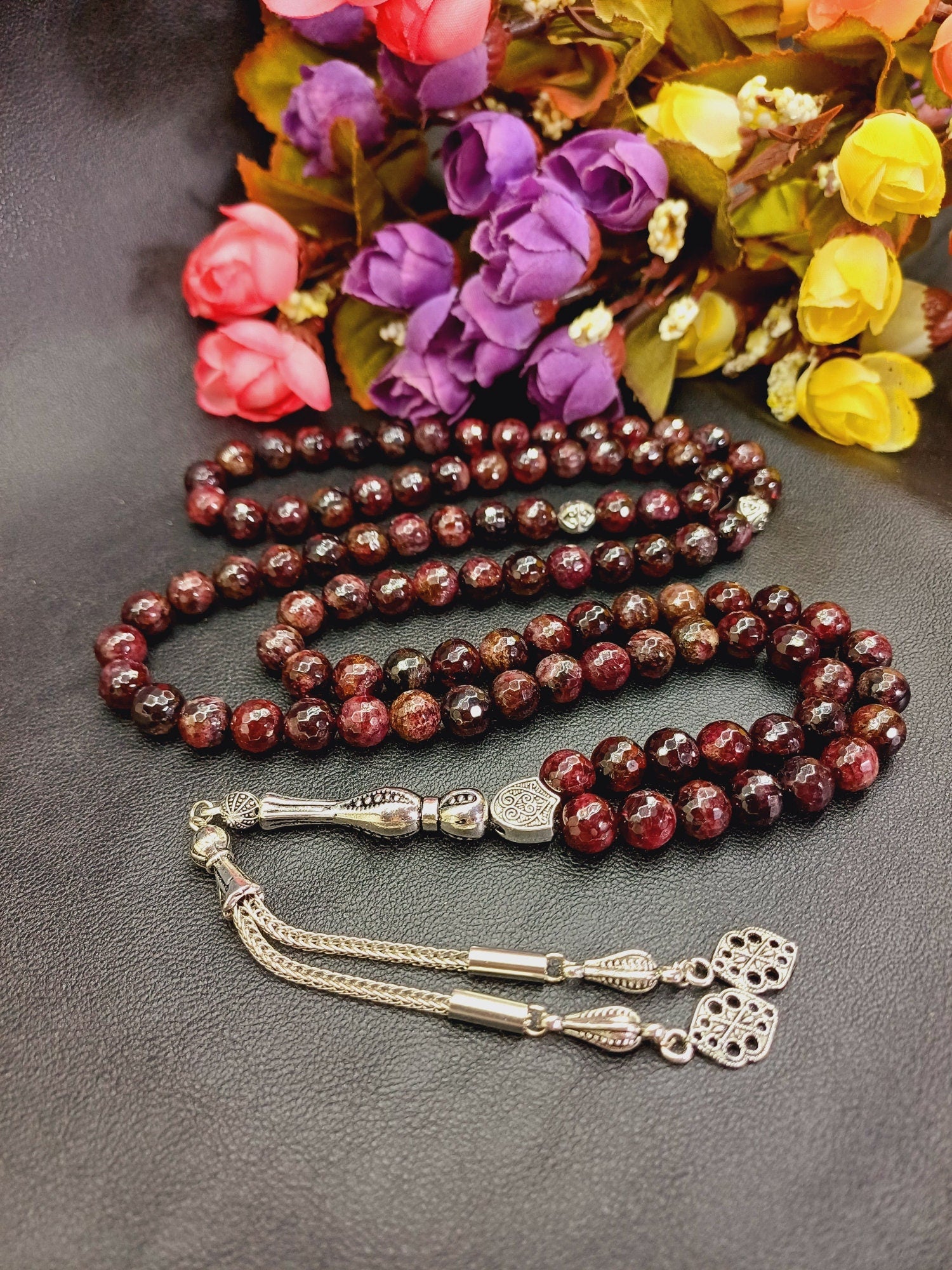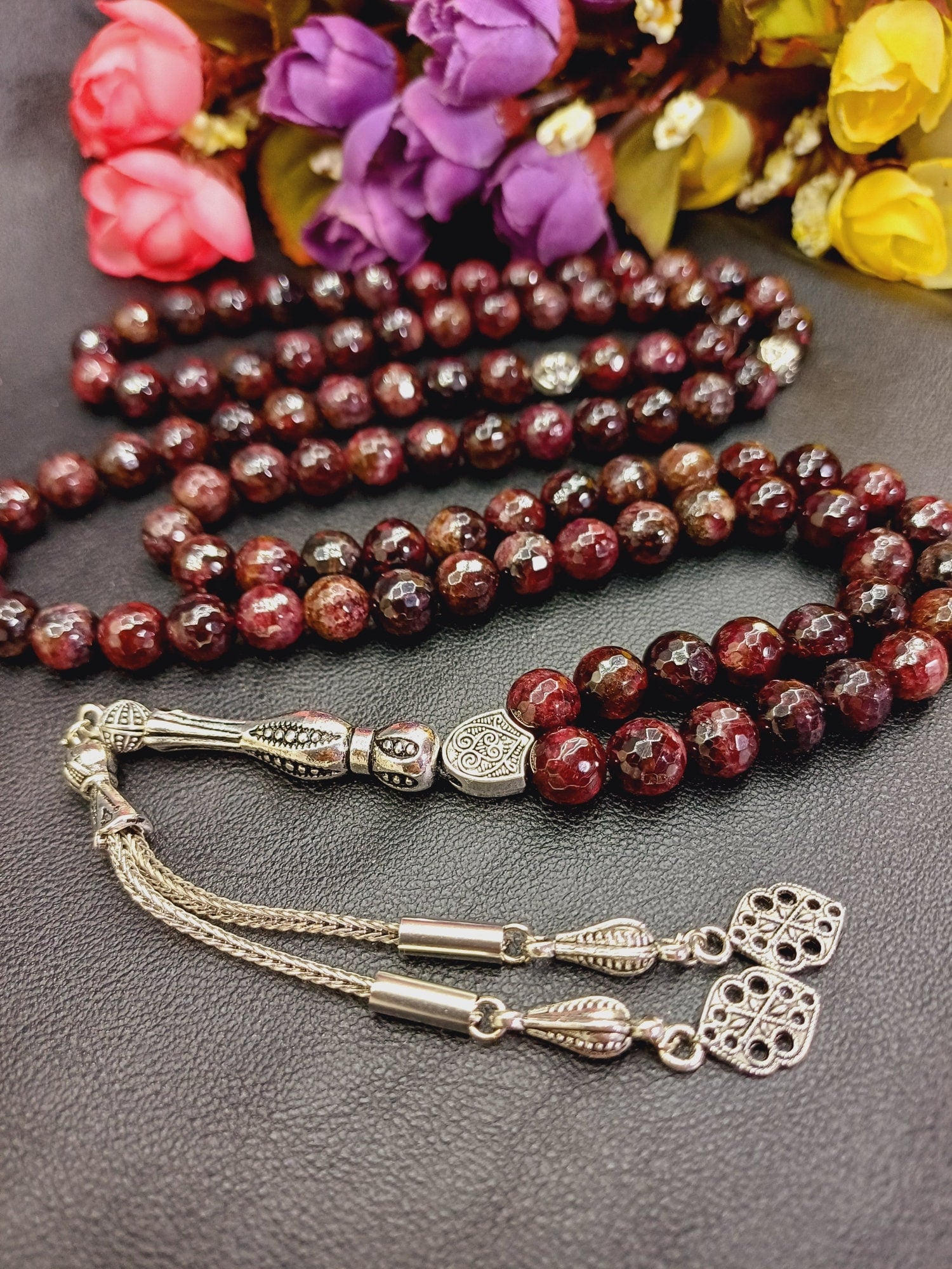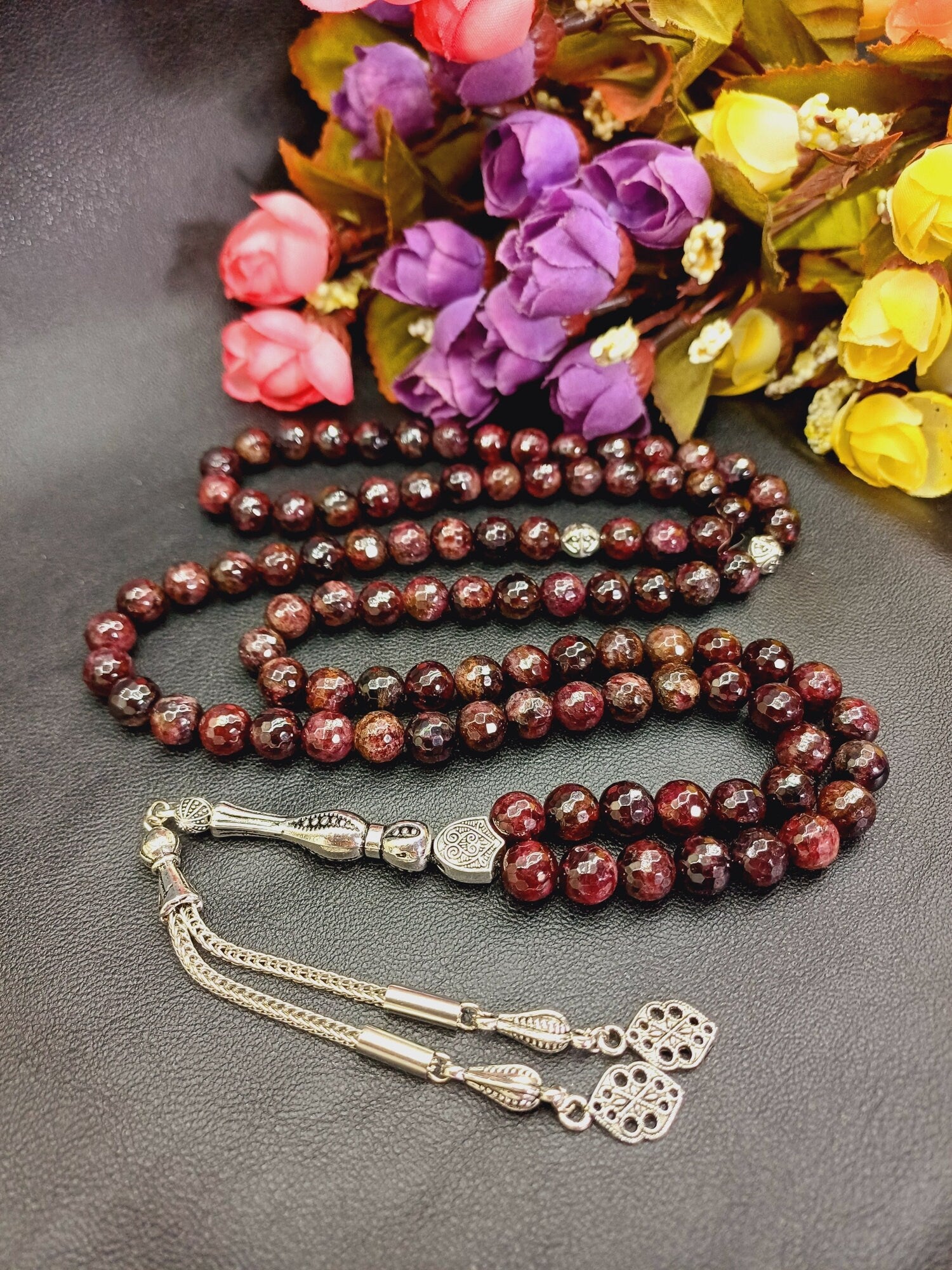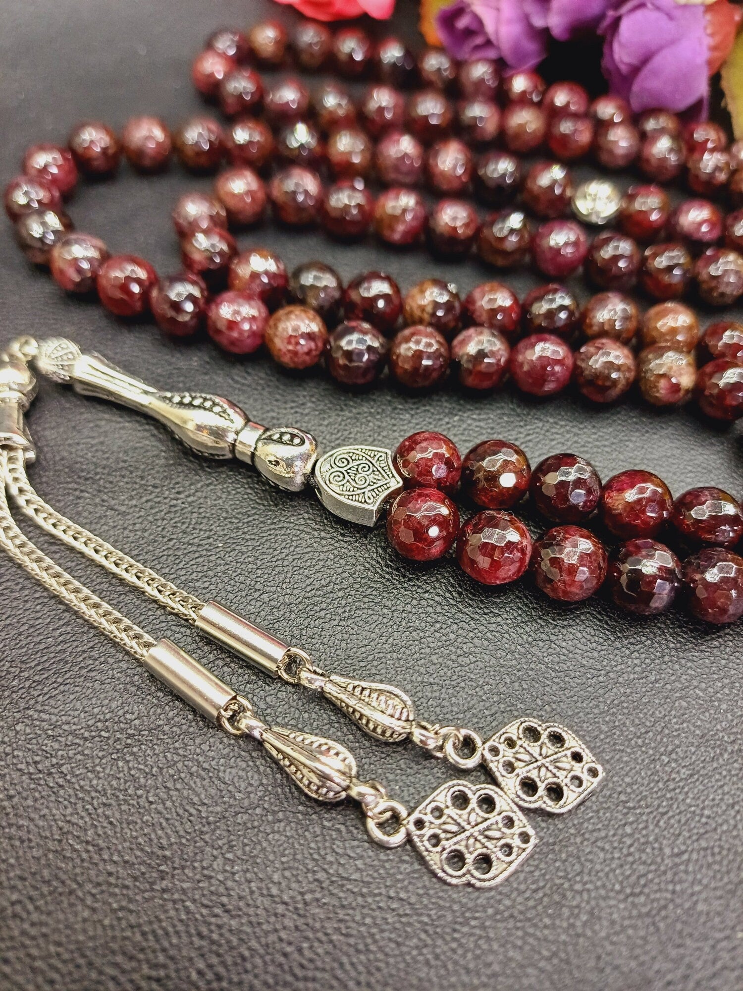 Mücevher kesim Lal taşı (garnet) doğal taşından yapılmış bu özel tesbih, hem şık bir aksesuar hem de enerjinizi dengelemeye yardımcı bir taş deneyimi sunar.
