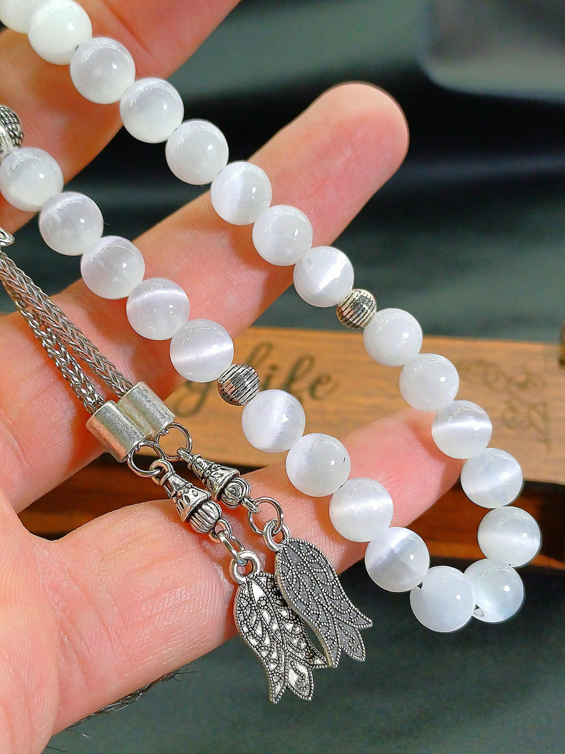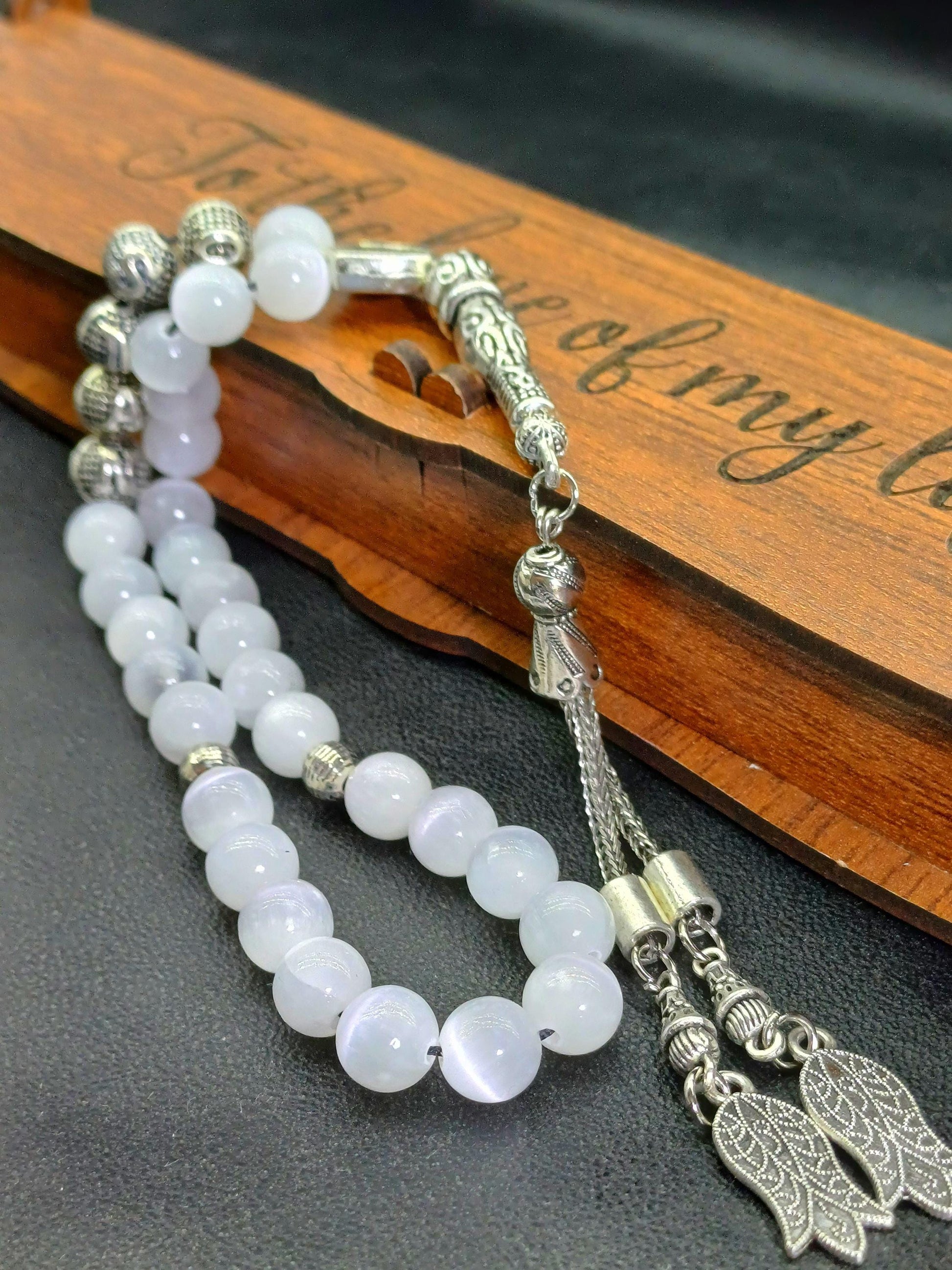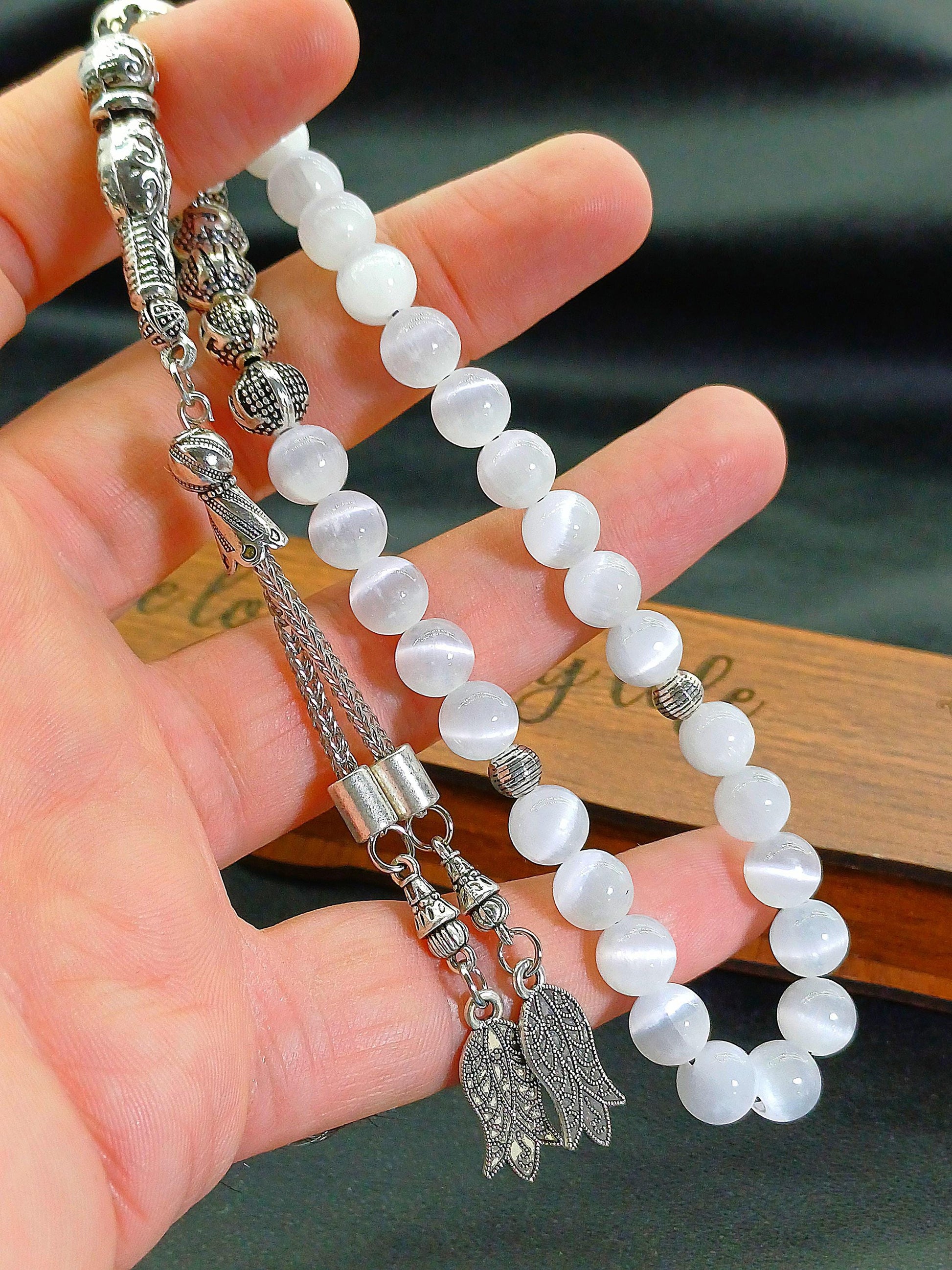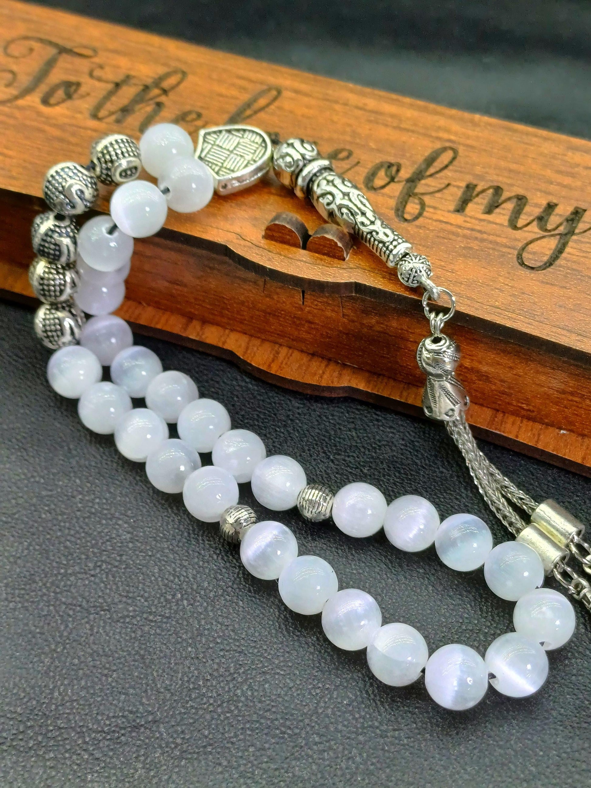 Selenit doğal taşından yapılmış bu özel tesbih, hem şık bir aksesuar hem de enerjinizi dengelemeye yardımcı bir taş deneyimi sunar.