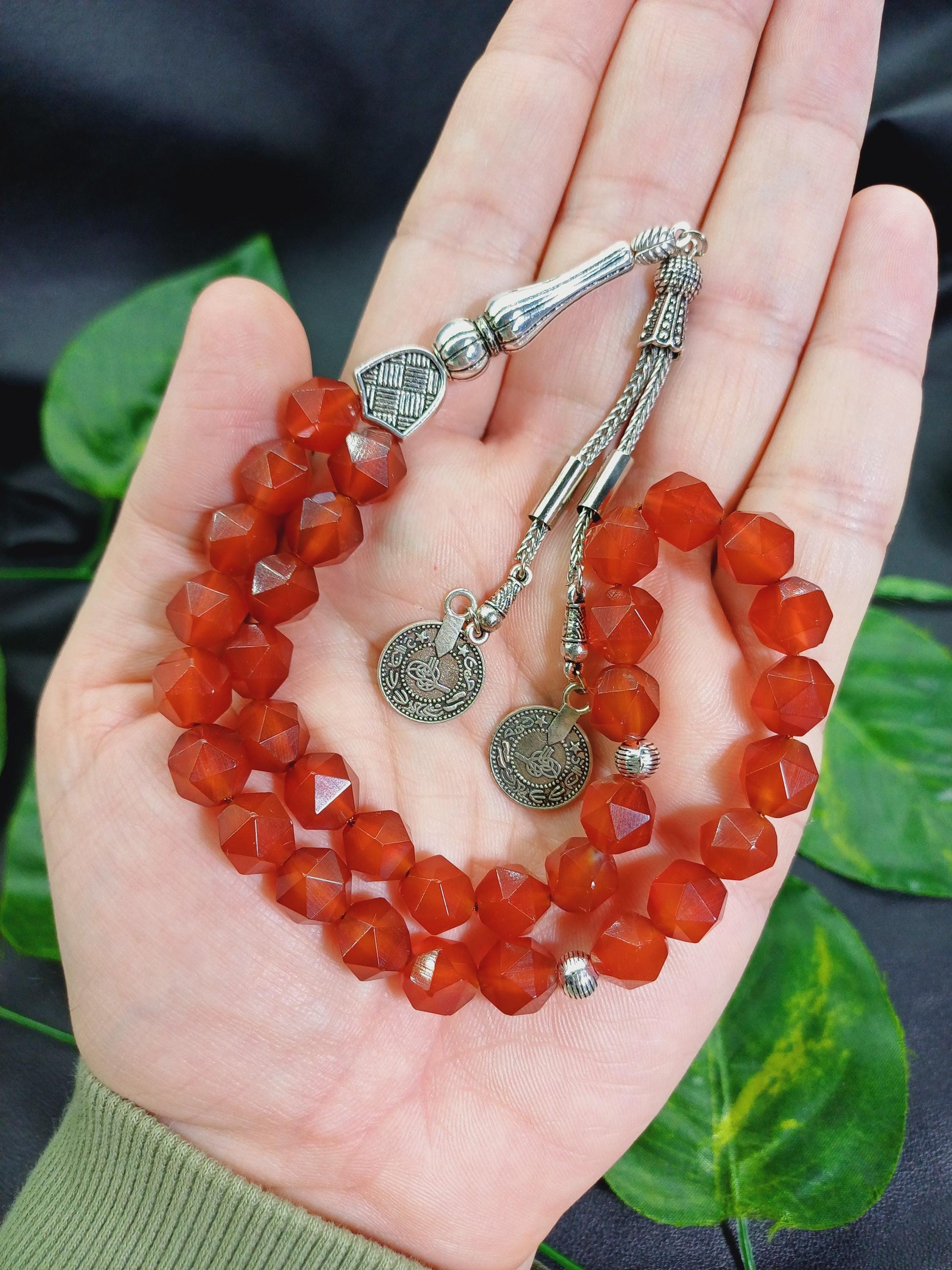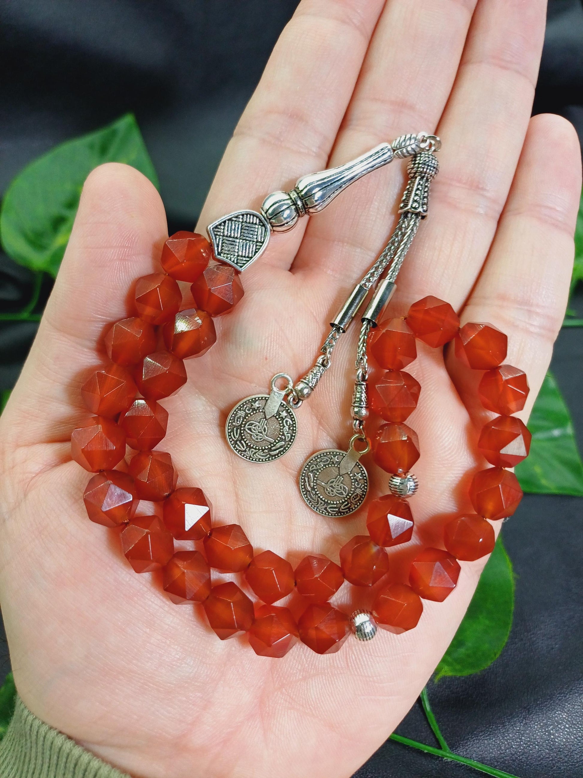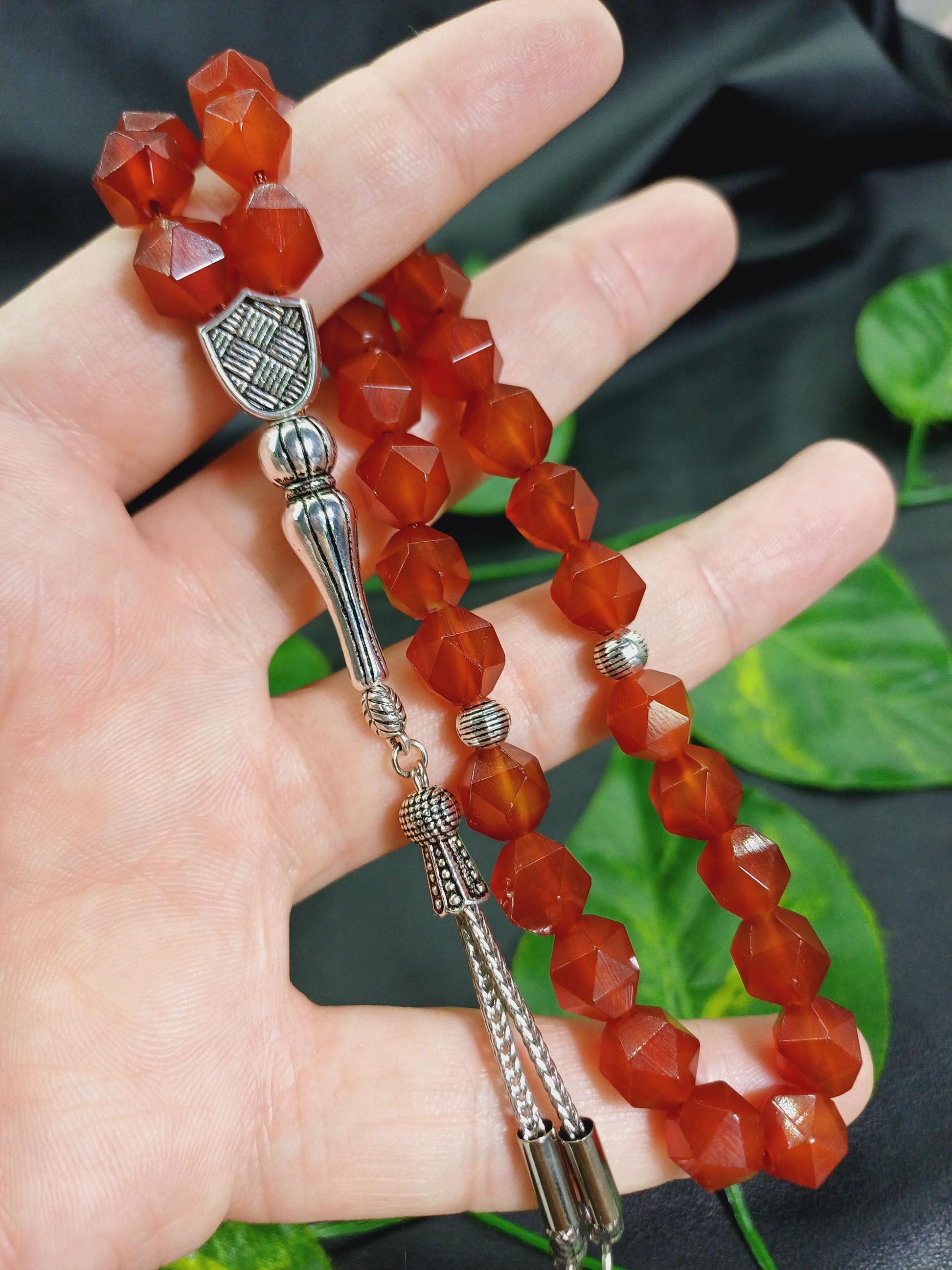 Altıgen Kesim Yemen Akik doğal taşından yapılmış bu özel tesbih, hem şık bir aksesuar hem de enerjinizi dengelemeye yardımcı bir taş deneyimi sunar.
